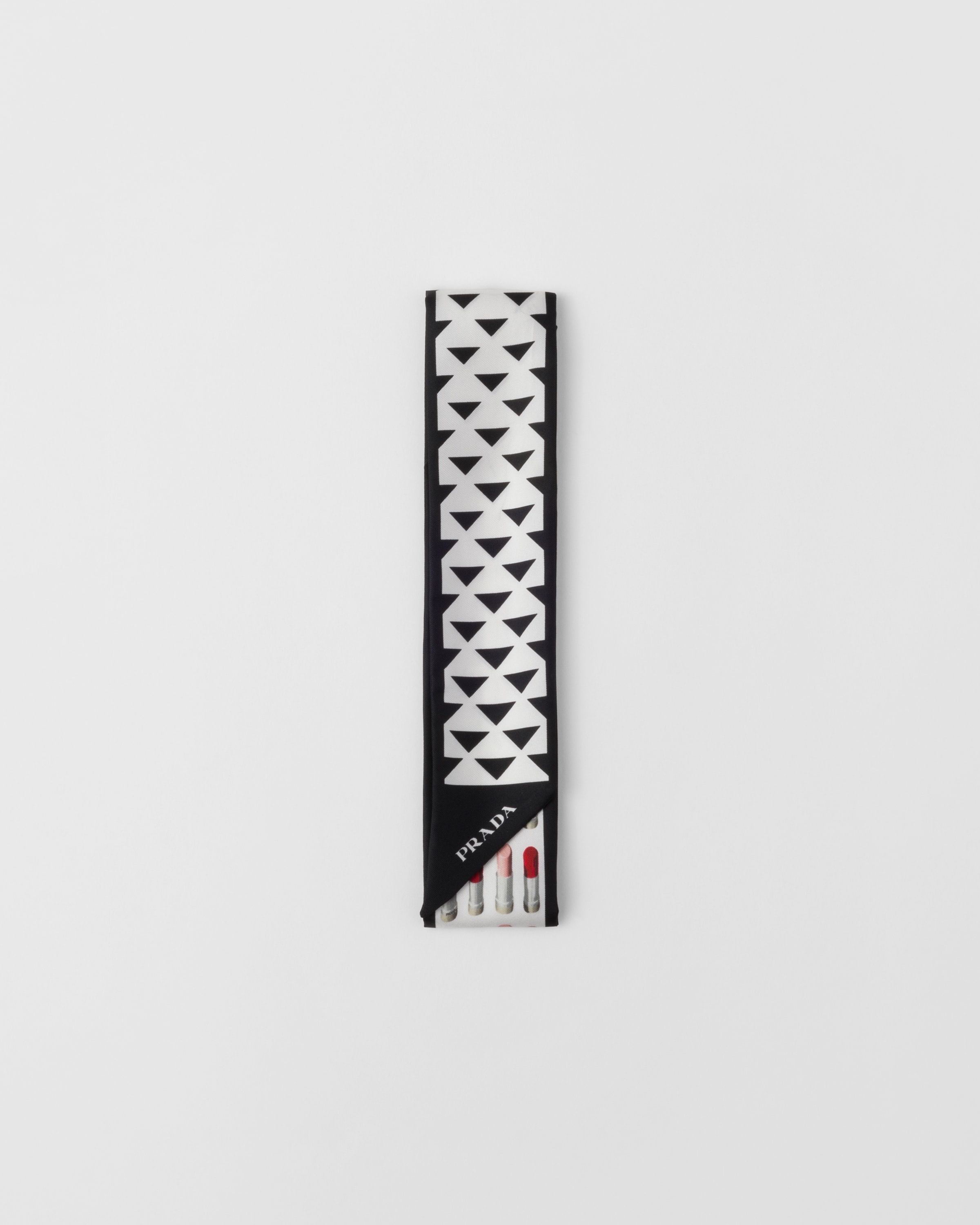 This silk skinny scarf, a perfect synthesis of Prada codes, is animated by a shaded geometric motif combined with an iconic and sophisticated archive print. - Product code: 1FF008_2C7F_F0967 - Prints: Degrade and Lipstick - Printed logo - Imported Height: 85cm Width: 6cm MATERIALS Main material: Silk