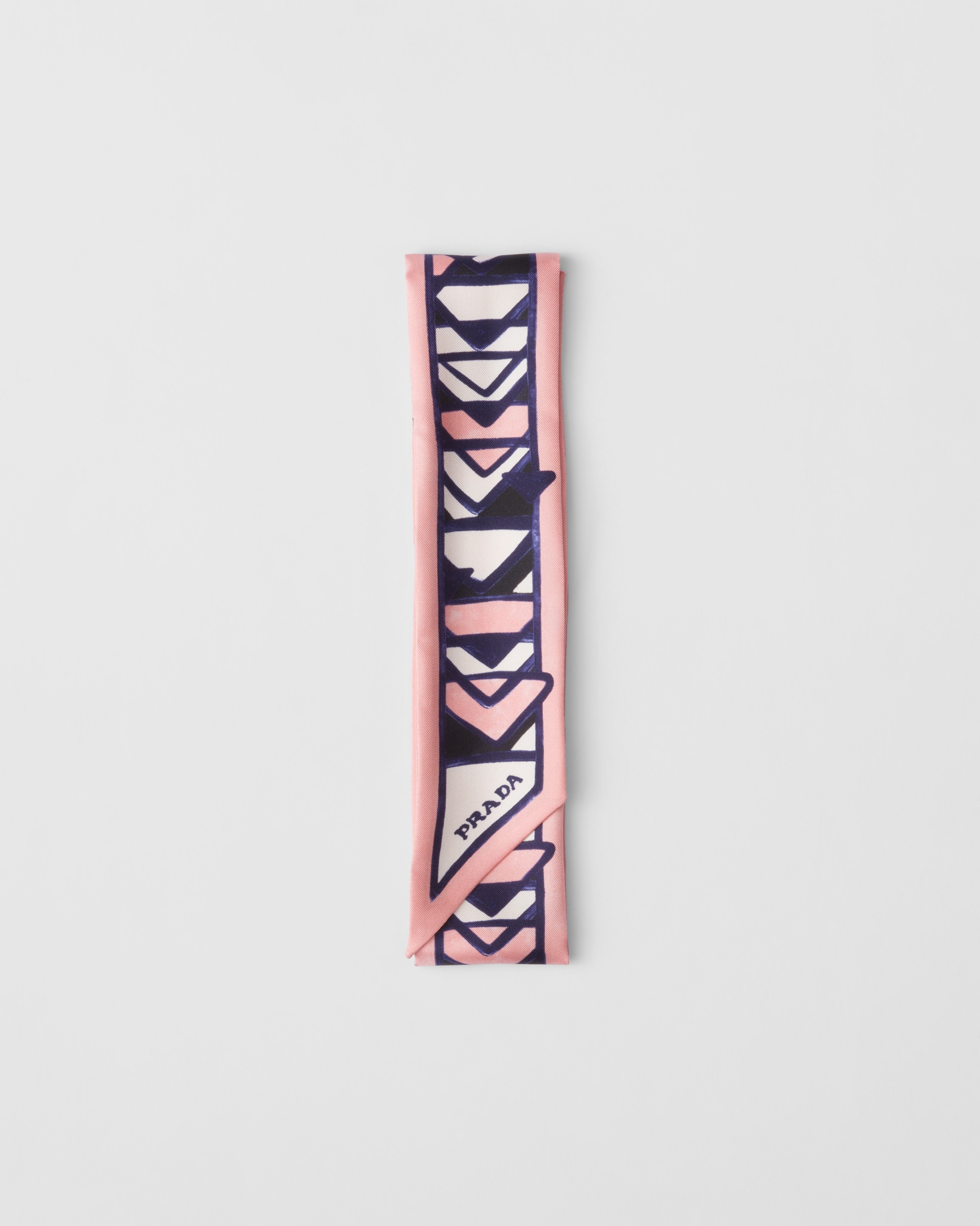 The iconic triangle, the distinctive signature of Prada collections, is the protagonist of the geometric print with modernist allure that animates this twill skinny scarf. The refined accessory is enriched by the lettering logo printed in a contrasting color. - Product code: 1FF008_2CNJ_F014C - Geometric print - Printed logo - Imported Height: 85cm Width: 6cm MATERIALS Main material: Silk