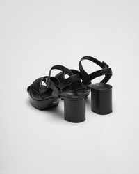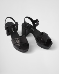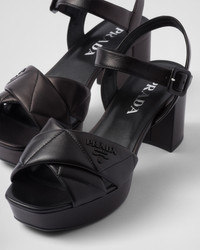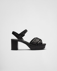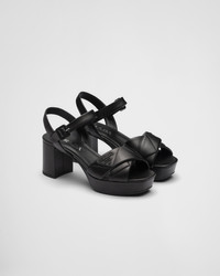 Prada's emblematic triangle logo is reinterpreted in the quilted patchwork motif and animates the straps of these soft nappa leather sandals. The design with chunky heel and platform is decorated with the metal lettering logo for an iconic accent. - Product code: 1XP43B_038_F0002_F_D065 - Upper with covered buckle - Metal lettering logo - Rubber sole with hot-stamped logo - 65 mm leather-covered heel - 25 mm leather-covered platform - Imported MATERIALS Main material: Lambskin