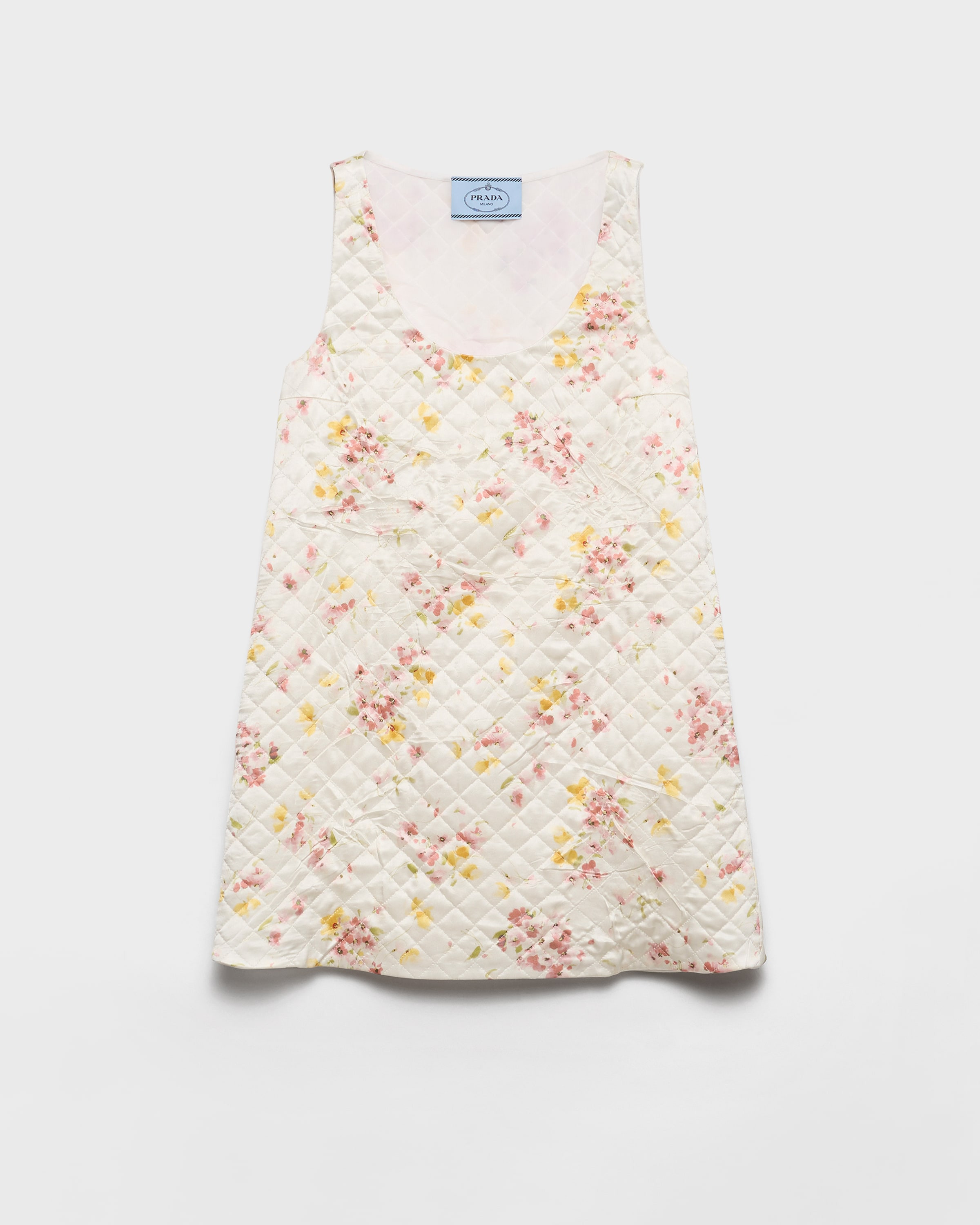 Romanticism and nostalgia blend in this short dress, crafted from quilted satin. The clean silhouette is enhanced by a delicate floral print that elevates the refined design with a vintage allure. - Product code: P3Q33_1758_F0638_S_OOO - “Bouquet” print - Flared fit - Lined - U-neck - Sleeveless - Side pockets - Fabric triangle logo - Straight hem - Imported - The model is 178 cm tall and wears a size 38 Height: 80cm MATERIALS Main material: 100% silk