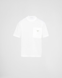 The Prada jersey T-shirt is one of the brand’s must-have items. Its luxurious simplicity and sophisticated allure reinvents basics, by giving them new meaning. This style is enhanced by a zipped front pocket in Re-Nylon, an innovative, sustainable fabric. An enameled-metal triangle logo provides an iconic allure. This product does not contribute to the SEA BEYOND educational program. - Product code: UJN661_11CK_F0009_S_221 - Boxy cut - Short sleeves - Ribbed collar - Straight hem - Enameled-metal triangle logo - Length: 70 cm; Size: M - Re-Nylon zipped front pocket - Imported - The model is 188 cm tall and wears a size 48 Height: 70cm MATERIALS Main material: 100% cotton