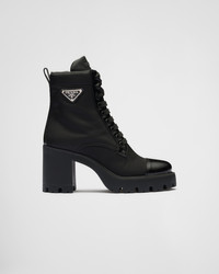 Rigorous formality reimagined in an innovative, modernist way inspires this versatile bootie that plays with different techniques and materials for an original result. The upper made of innovative Re-Nylon, which is obtained from recycled plastic collected in the ocean, contrasts in part with brushed leather while the rubber sole completes the design. This product does not contribute to the SEA BEYOND educational program. - Product code: 1T239N_3LFU_F0002_F_085 - Upper with flat polyester laces - Leather lining - Enameled metal triangle logo - 14 cm boot leg - 85 mm rubber monoblock sole - Stamped rubber welt - Imported MATERIALS Main material: Recycled polyamide