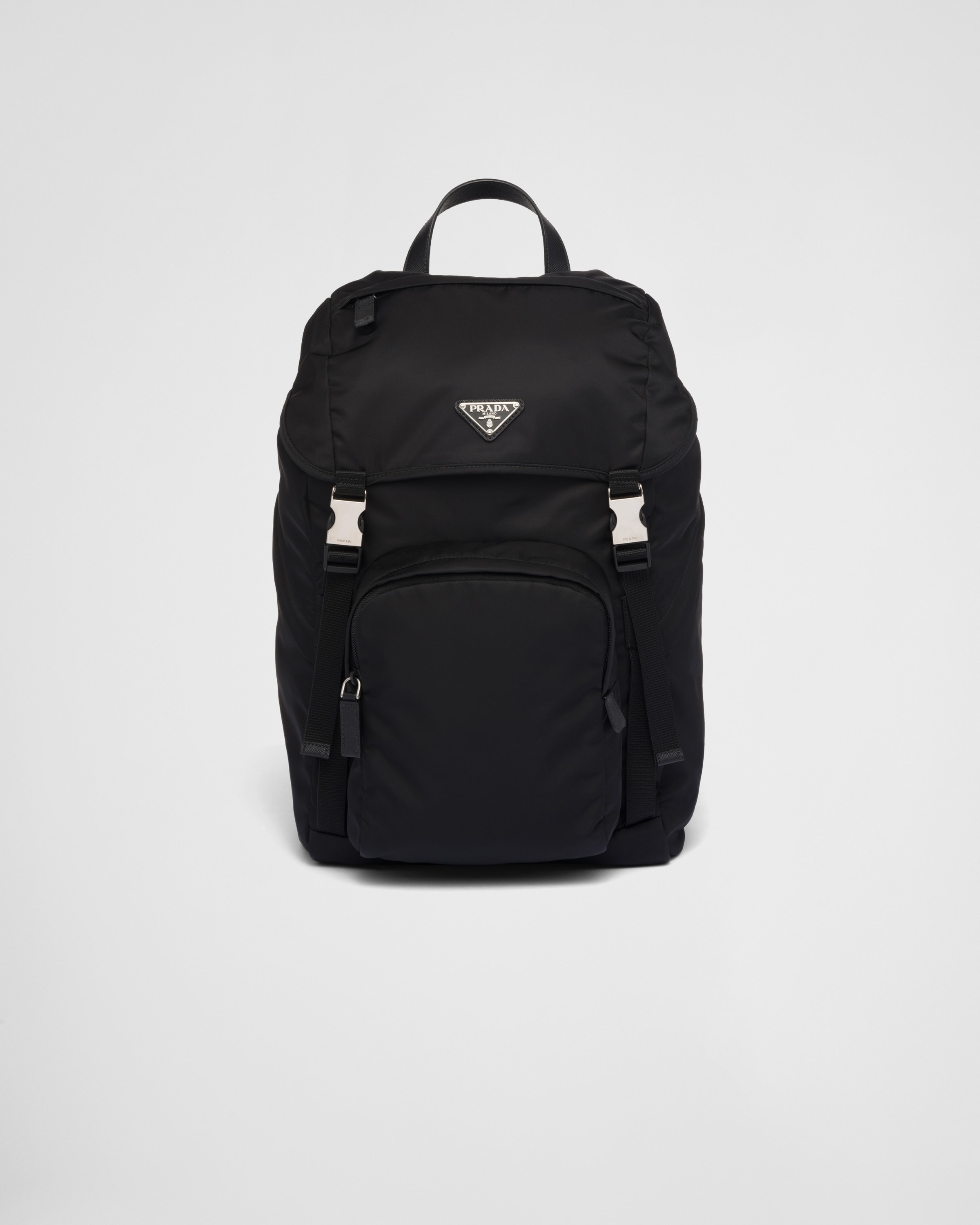 The evolution of an iconic Prada style since the eighties, this nylon backpack is made of Re-Nylon, a regenerated yarn produced from recycled, purified plastic trash collected in the ocean, fishing nets, and textile waste fibers. This technologically innovative fabric is paired with Saffiano leather, an historic material of Prada tradition defined by its crosshatch pattern and waxed finish. The enameled metal triangle logo accents the compact design with flap and oversized front pocket. For sustainable care to preserve the product's characteristics and reduce microfiber shedding, we recommend not washing the item too often. Let the product air out after every use and have it dry cleaned at a specialized ecological dry cleaners. - Product code: 2VZ135_2DMG_F0002_V_HOL - Leather handle - Adjustable woven nylon straps - Enameled metal triangle logo on flap - Push-lock clasp on the flap - Four external zipper pockets - Padded mesh fabric back - Interior with zipper pocket and patch pocket - Re-Nylon lining - Imported Height: 45cm Width: 27cm Length: 17cm MATERIALS Main material: Recycled polyamide