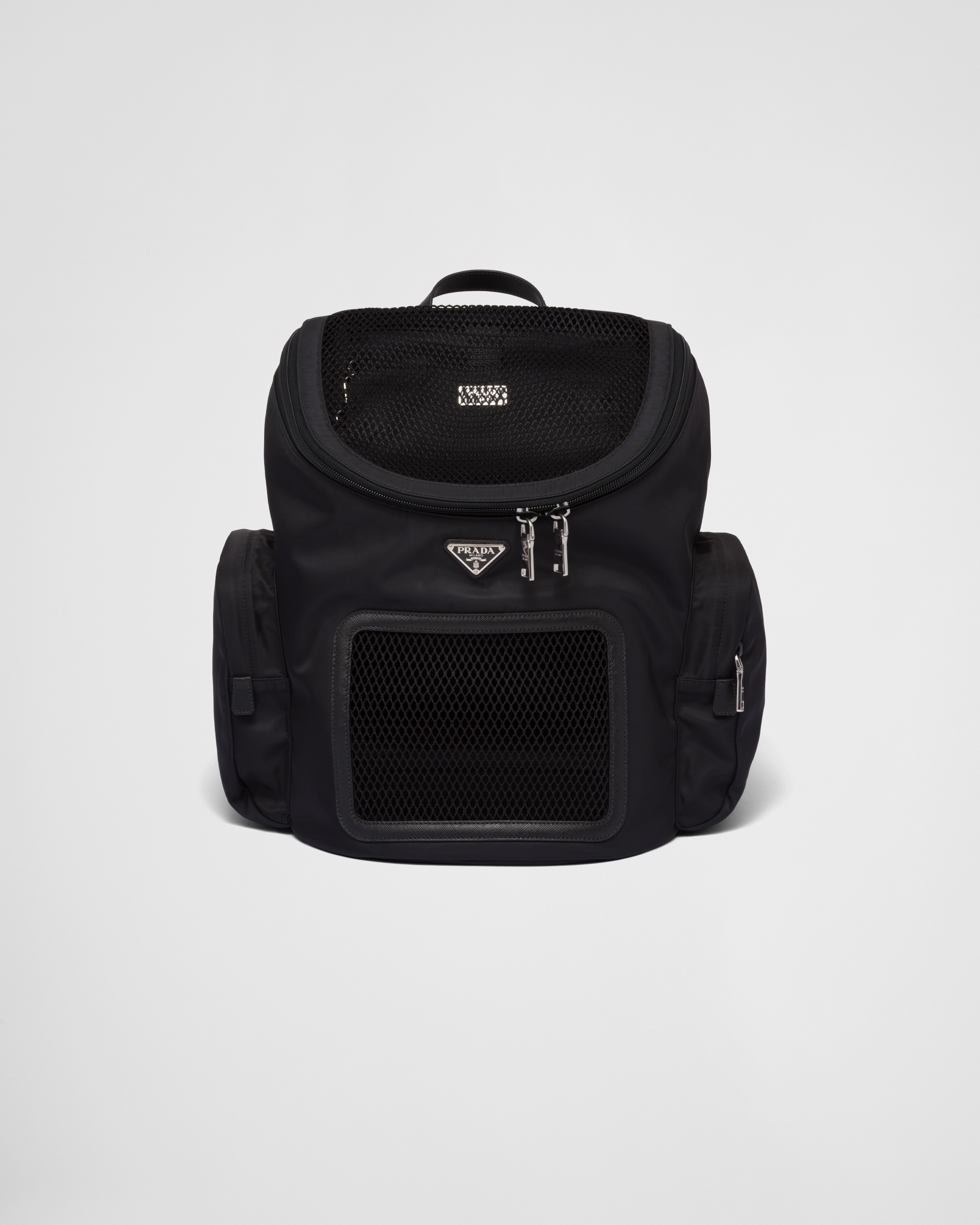A travel accessory designed to carry your pet, this backpack pet bag is made with a combination of iconic materials of the brand: Saffiano leather and nylon, a fabric first introduced in the luxury world by Prada. Decorated with the iconic triangle logo, the equipped design has external pockets and essential pet care accessories inside like a strap for the collar, food bowl and pet waste bag holder. For sustainable care to preserve the product's characteristics and reduce microfiber shedding, we recommend not washing the item too often. Let the product air out after every use and have it dry cleaned at a specialized ecological dry cleaners. - Product code: 2VZ083_2DMT_F0002_V_OOO - Saffiano leather handle - Adjustable woven nylon strap - Enameled metal triangle logo on the front - Zipper closure - Pet waste bag holder - Two external zipper pockets - Padded mesh back - Interior with removable bottom, strap for the collar and food bowl - Re-Nylon lining - Imported Height: 41cm Width: 28cm Length: 28cm MATERIALS Fabric/Leather