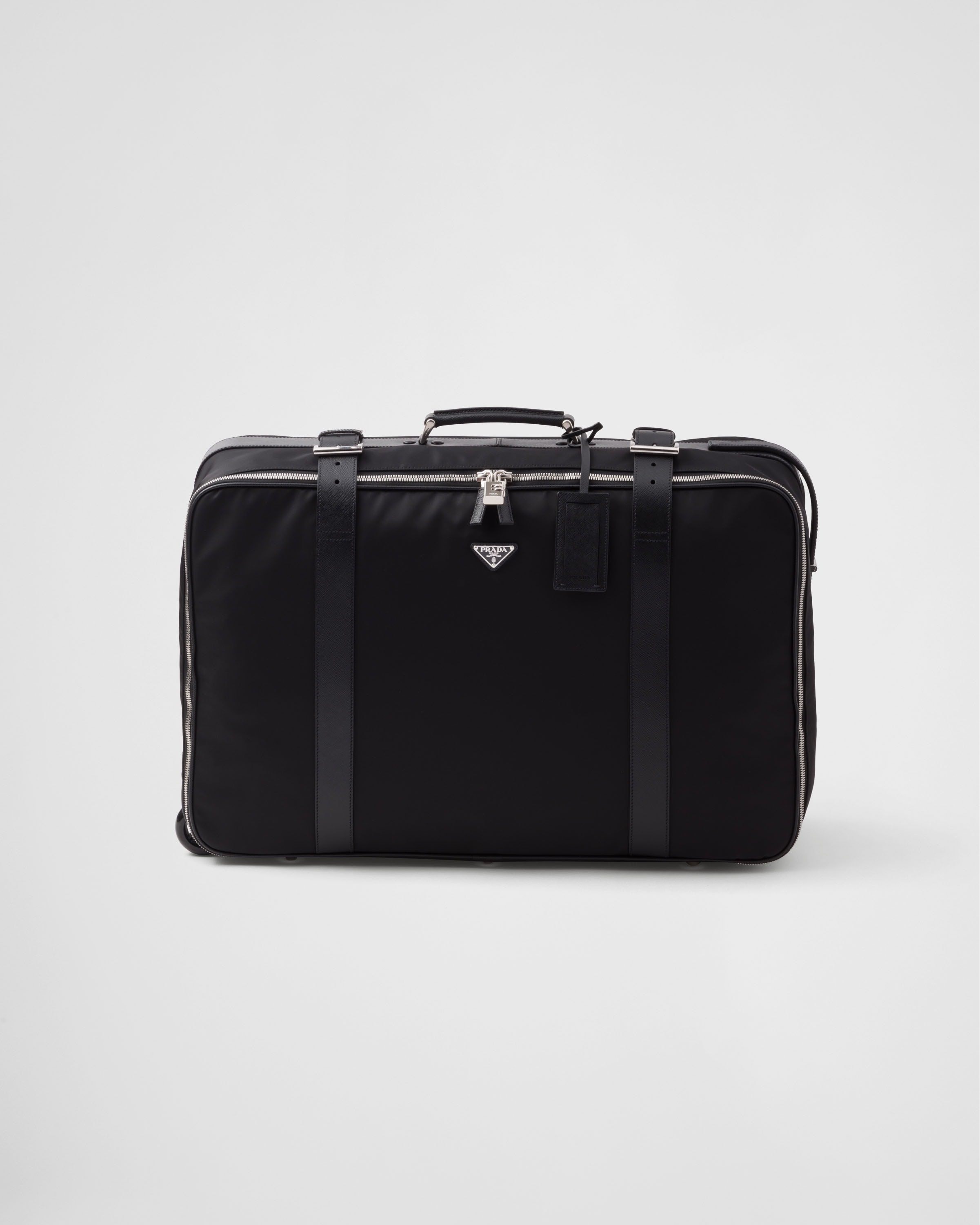 Charming, vintage details meet the modern and pragmatic character of Re-Nylon in the design of this suitcase embellished with Saffiano leather details. The semi-rigid silhouette, characterized by the leather handle and two wheels, is completed by the iconic signature of the enameled metal triangle logo. For sustainable care to preserve the product's characteristics and reduce microfiber shedding, we recommend not washing the item too often. Let the product air out after every use and have it dry cleaned at a specialized ecological dry cleaners. - Product code: 2VV41B_2DMH_F0002_V_OOO - With adjustable straps - Leather handle - Enameled metal triangle logo on the front - Zipper closure and lock - Removable leather name tag - Interior with leather straps and buckle and with zipper pocket - Logo-print Re-Nylon lining - Two wheels and feet - Imported Height: 42cm Width: 65cm Length: 22cm MATERIALS Main material: Recycled polyamide