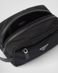This travel pouch with a sleek, functional design is made of Re-Nylon, a functional material and vehicle of experimentation produced from recycled and purified plastic trash collected in the oceans, fishing nets, and textile fiber waste. The accessory with enameled triangle logo and top zipper closure is decorated with Saffiano leather details, calf leather of the highest quality defined by a crosshatch texture and wax finish that identifies with traditional Italian leather goods production. For sustainable care to preserve the product's characteristics and reduce microfiber shedding, we recommend not washing the item too often. Let the product air out after every use and have it dry cleaned at a specialized ecological dry cleaners. - Product code: 2NA819_2DMH_F0002 - Leather handle - Enameled metal triangle logo on the front - Zipper closure - Two external zipper pockets - Inside zipper pocket - Re-Nylon lining - Imported Height: 12.5cm Width: 22cm Length: 11cm MATERIALS Main material: Recycled polyamide