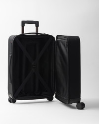 Sleek lines and details animate the design of this elegant and pragmatic trolley enhanced by the exclusive combination of Re-Nylon, the innovative regenerated nylon yarn, and Saffiano leather. The accessory, embellished with the sophisticated touch of the leather name tag, is decorated with the iconic signature of the enameled metal triangle logo. For sustainable care to preserve the product's characteristics and reduce microfiber shedding, we recommend not washing the item too often. Let the product air out after every use and have it dry cleaned at a specialized ecological dry cleaners. - Product code: 2VQ005_2DMH_F0002_V_OOO - Leather handle - Enameled metal triangle logo on the front - Zipper closure with TSA combination lock - Removable leather name tag - Telescopic handle on the back - Interior with elastic straps and zipper pocket - Logo-print Re-Nylon lining - Four wheels - Cabin size - Weight: 3,390 kg - Capacity: 33.5 L - Imported Height: 56cm Width: 36cm Length: 22cm MATERIALS Main material: Recycled polyamide