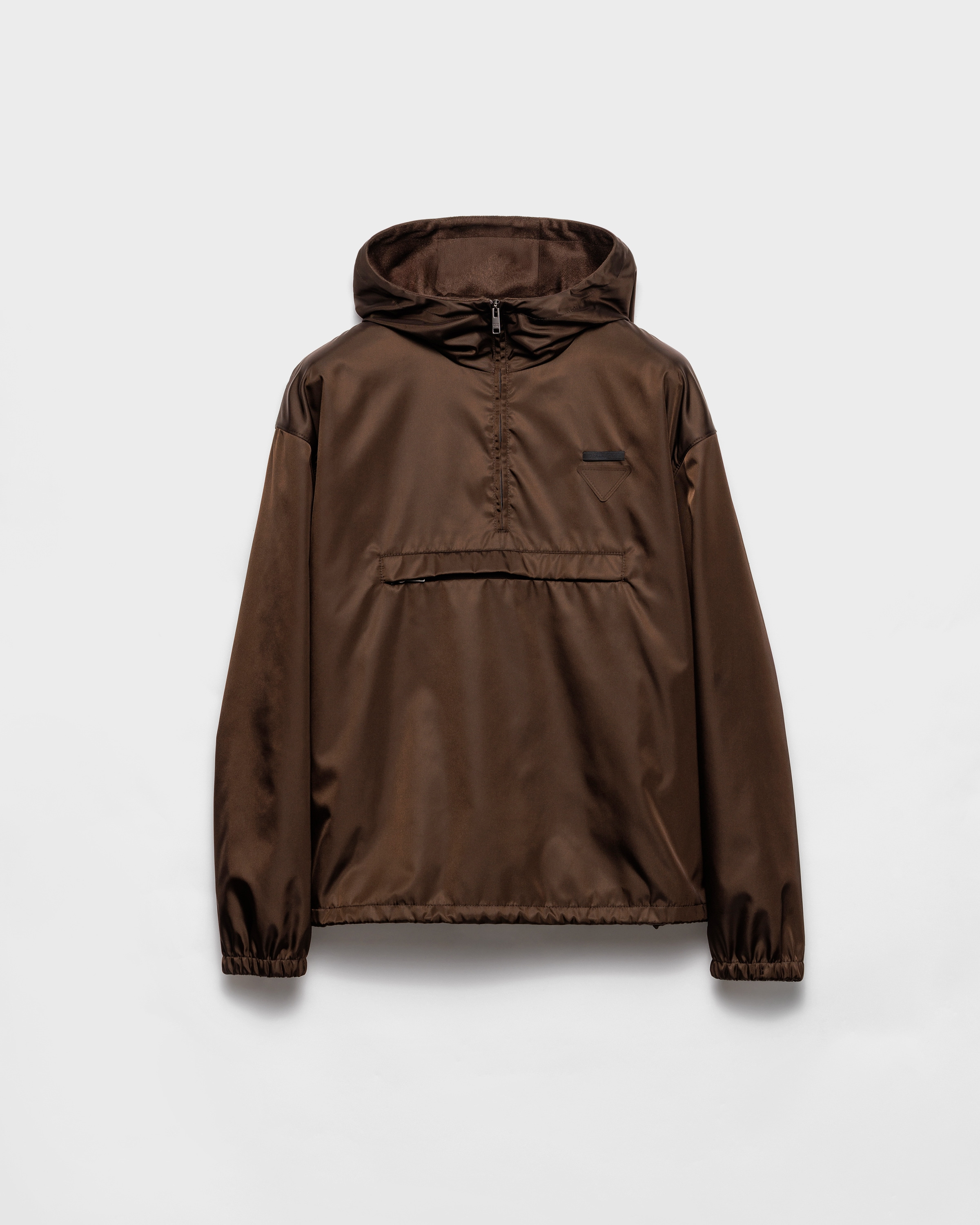 This anorak made of Re-Nylon has a sporty design with minimalist style. The characteristic lightness and water-repellent properties of regenerated nylon define the contemporary, functional and versatile garment. - Product code: SGC907_1WQ8_F0AEZ_S_OOO - Oversized fit - Stand-up collar with hood - Straight sleeve - Zipper closure - Welt pockets with hidden zipper - Elasticized cuff - Drop shoulder - Straight hem - Elasticized drawstring - Lined - Fabric triangle logo and sartorial logo label - Imported - The model is 188 cm tall and wears a size 48 Height: 72cm MATERIALS Main material: 100% recycled polyamide