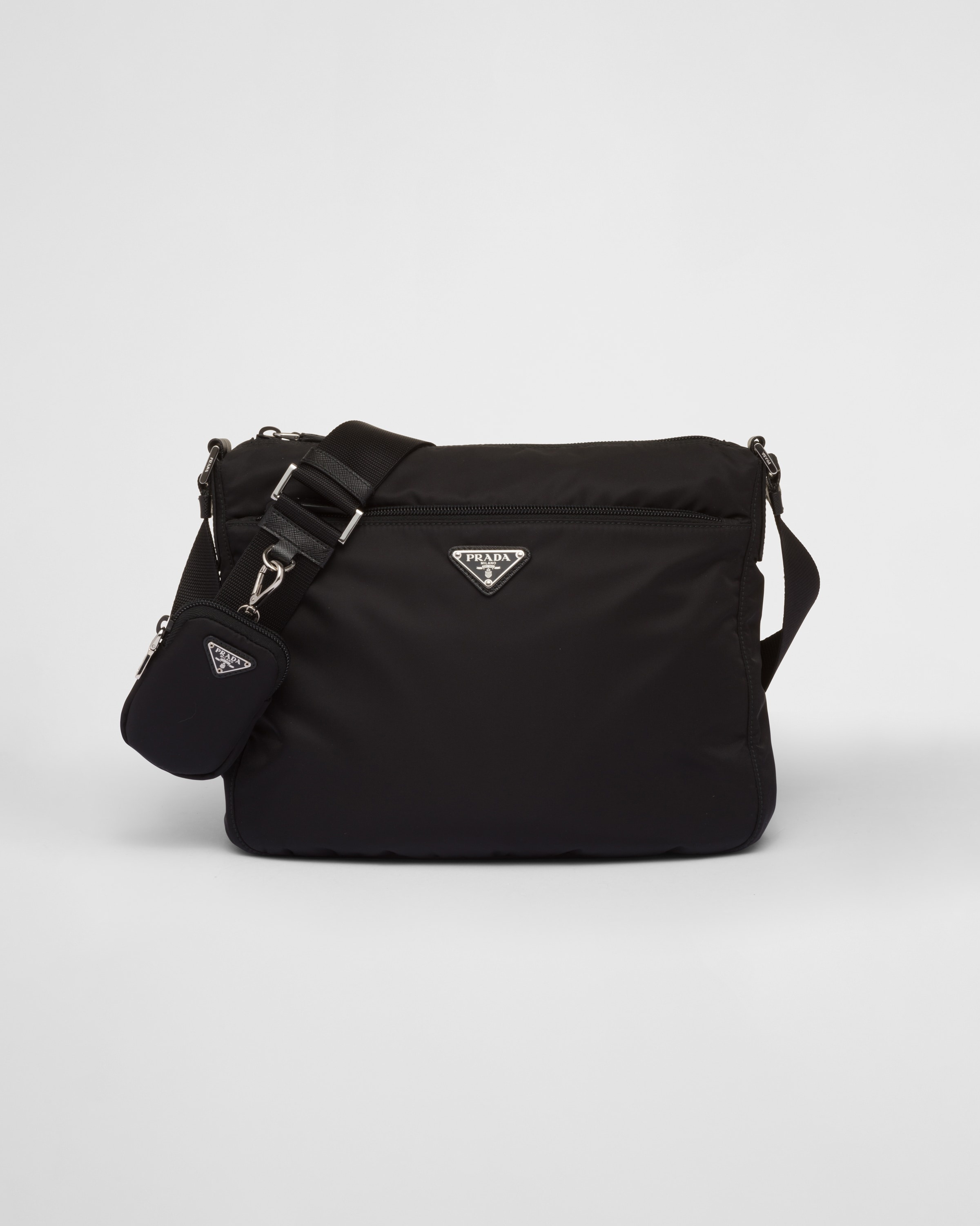 This sleek shoulder bag with roomy compartments and pockets is made of Re-Nylon: a regenerated nylon yarn produced from recycled, purified plastic materials collected in the ocean, fishing nets, and textile fibers. Steel-finish metal hardware characterizes the exterior, while the logo-print lining enhances the interior. For sustainable care to preserve the product's characteristics and reduce microfiber shedding, we recommend not washing the item too often. Let the product air out after every use and have it dry cleaned at a specialized ecological dry cleaners. - Product code: 1BC421_RV44_F0002_V_D1M - Adjustable woven shoulder strap, length: 95 cm - Removable Re-Nylon pouch with zipper closure - Zipped pocket - Metal hardware - Pocket with enameled metal triangle logo - Zipper closure - Re-Nylon logo lining, two inner pockets, one with zipper - Imported Height: 24cm Width: 29.5cm Length: 9cm MATERIALS Main material: Recycled polyamide