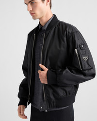 Soft volumes define the silhouette of this Re-Nylon bomber jacket featuring functional details and decorated with the enameled metal triangle logo. For sustainable care to preserve the product's characteristics and reduce microfiber shedding, we recommend not washing the item too often. Let the product air out after every use and have it dry cleaned at a specialized ecological dry cleaners. - Product code: SGC824_1WQ8_F0002_S_OOO - Regular fit - Ribbed knit collar - Straight sleeve - Zipper closure - Pockets with flap and button - Ribbed knit cuffs - Drop shoulder - Straight hem - Lined and quilted - Enameled metal triangle logo - The fabric is made with regenerated yarn obtained from recycled plastic materials collected in the ocean - Imported - The model is 189 cm tall and wears a size 48 Height: 65cm MATERIALS Main material: 100% recycled polyamide