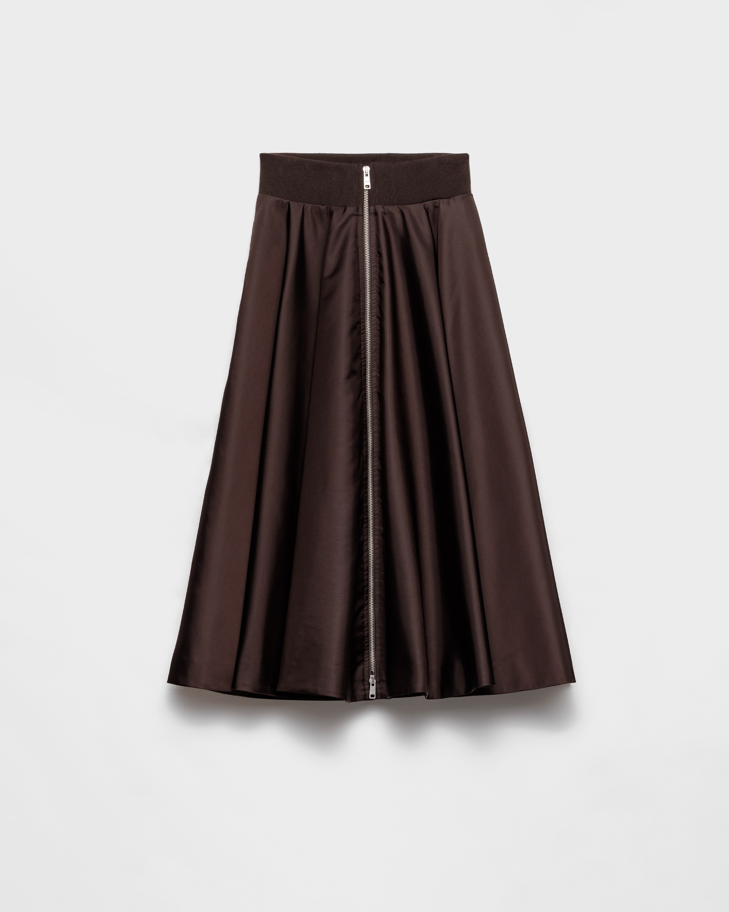 Pragmatic, lightweight Re-Nylon adds a sporty touch to this circle skirt, an iconic style of Prada collections. The style is defined by its high waist and full, soft lines, completed by the zipper closure and knit detail. For sustainable care to preserve the product's characteristics and reduce microfiber shedding, we recommend not washing the item too often. Let the product air out after every use and have it dry cleaned at a specialized ecological dry cleaners. - Product code: 21H010_1WQ8_F0003_S_OOO - Lined garment - Zipper closure - Conceptual triangle logo - Inseam pockets - High waist - Ribbed knit waist detail - Pressed garment - Imported - The model is 180 cm tall and wears a size 38 Height: 75cm MATERIALS Main material: 100% recycled polyamide