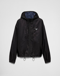 Clean lines and sleek details define this oversized Re-Nylon jacket with hood. The reversible design is decorated with the enameled metal triangle logo. For sustainable care to preserve the product's characteristics and reduce microfiber shedding, we recommend not washing the item too often. Let the product air out after every use and have it dry cleaned at a specialized ecological dry cleaners. - Product code: SGC603_1WQ9_F0D9M_S_OOO - Oversized fit - Stand-up collar with hood - Straight sleeve - Zipper closure - Pockets with hidden zipper - Elasticized cuff - Wide shoulder - Elasticized hem - Elasticized drawstring - Reversible - Enameled metal triangle logo on the front - Imported - The model is 189 cm tall and wears a size 48 Height: 70cm MATERIALS Main material: 100% recycled polyamide