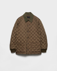 In this quilted jacket, Re-Nylon acquires a new shape, giving substance to movement. Each detail, from the collar to the snaps, help create a balanced visual rhythm. - Product code: SGD001_1WQ9_F0161_S_OOO - Regular fit - Shirt-style collar - Straight sleeve - Snap closure - Patch pockets - Ribbed knit cuff - Regular shoulder - Straight hem - Unlined and quilted - Enameled metal triangle logo on the front - The fabric is made with regenerated yarn obtained from plastic materials collected in the ocean - Imported - The model is 190 cm tall and wears a size 48 Height: 76cm MATERIALS Main material: 100% recycled polyamide