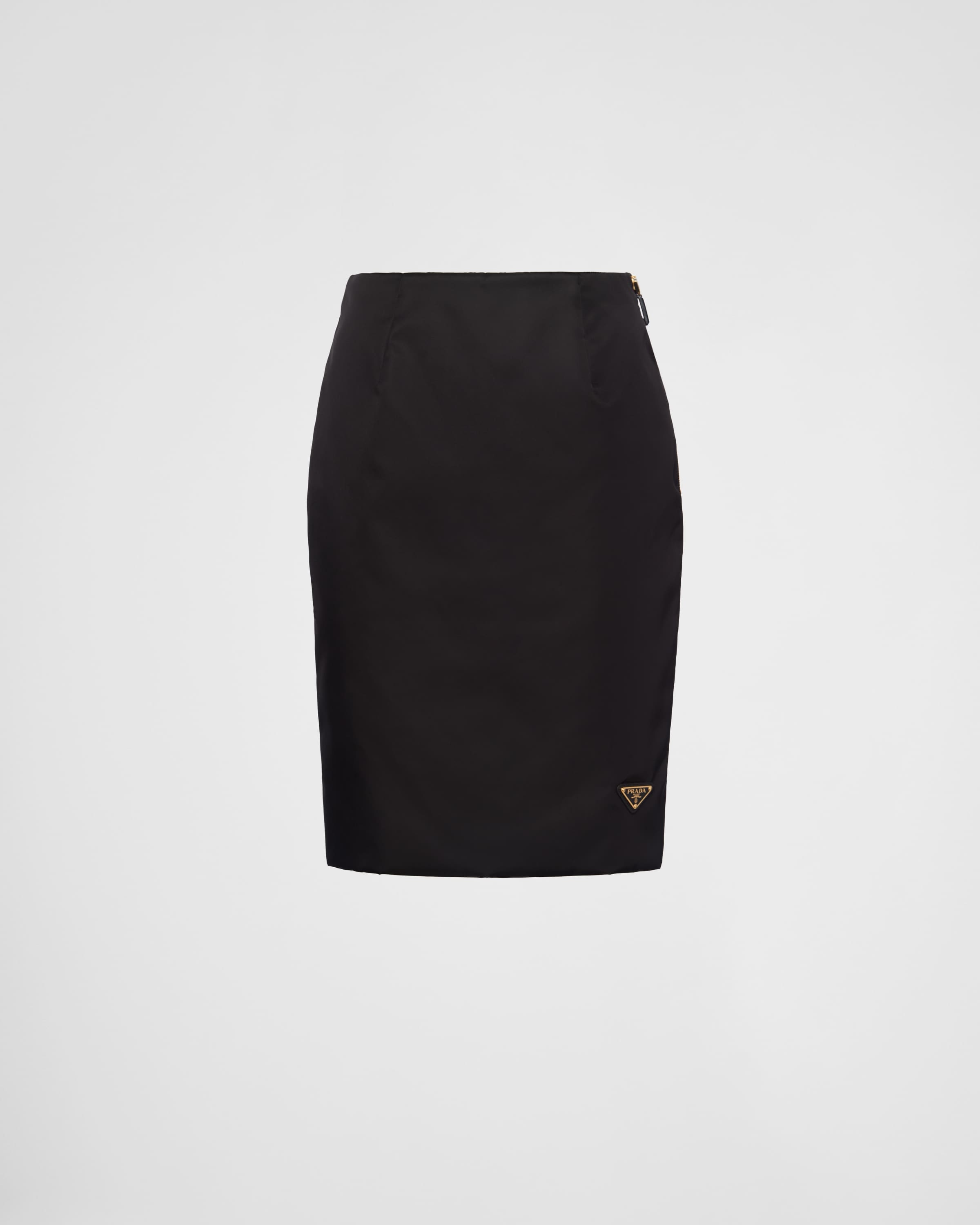 The pencil skirt is reinterpreted with innovative details and light volumes that give contemporary allure to the classic silhouette. Made of Re-Nylon, Prada's emblematic yarn made of regenerated nylon, the style combines sleek lines with refined, versatile elements. The hybrid garment is completed by the iconic signature of the enameled metal triangle logo. For sustainable care to preserve the product's characteristics and reduce microfiber shedding, we recommend not washing the item too often. Let the product air out after every use and have it dry cleaned at a specialized ecological dry cleaners. - Product code: 21H964_1WQ8_F0002_S_232 - Lined - Zipper closure - Enameled metal triangle logo - Logo-print leather zipper pull - Padded - Imported - The model is 180 cm tall and wears a size 38 Height: 55cm MATERIALS Main material: 100% recycled polyamide