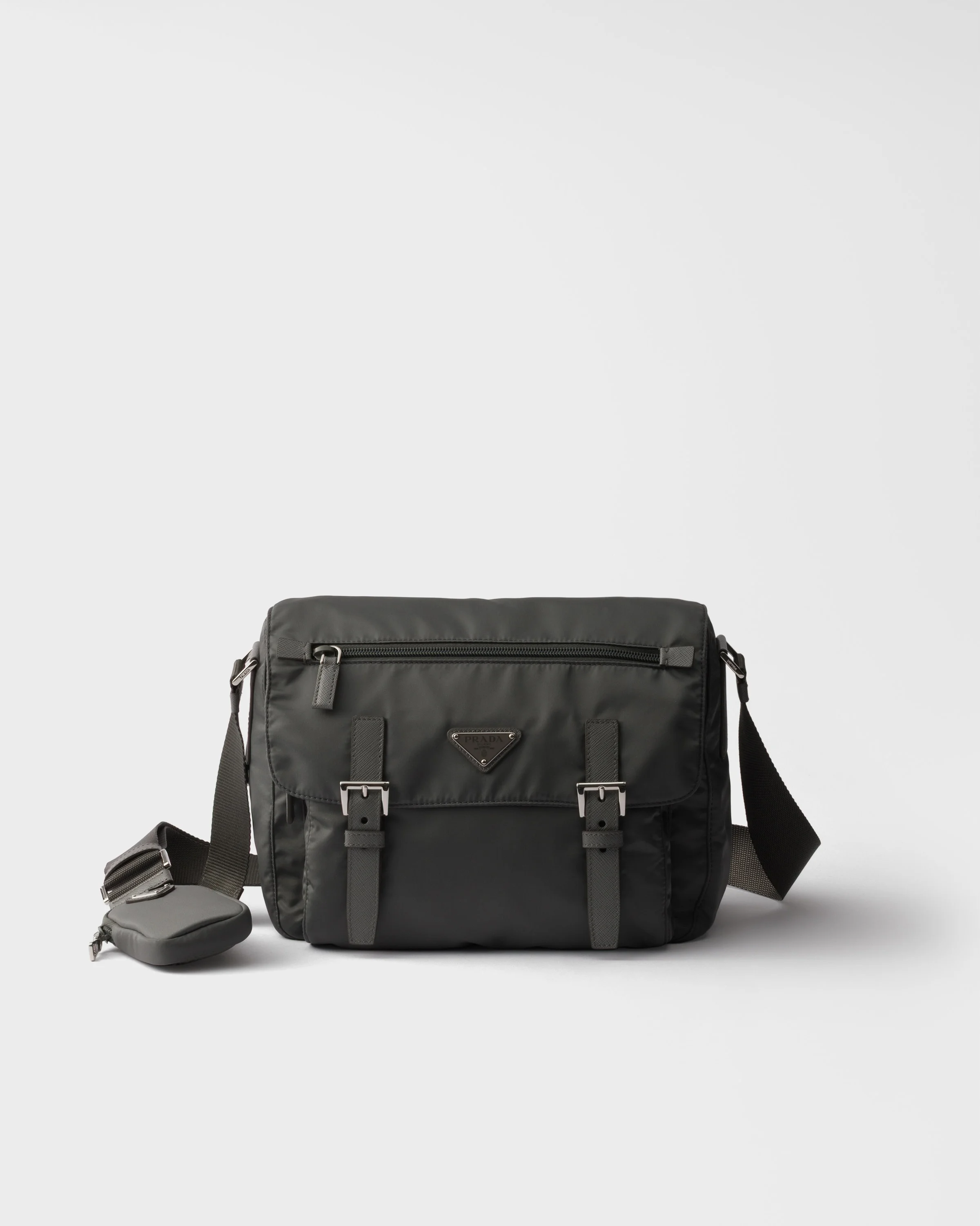 This shoulder bag with roomy compartments and pockets is made of Re-Nylon: a regenerated nylon yarn (ECONYL®) produced from recycled, purified plastic collected in the ocean, fishing nets and textile waste fibers. The design is enhanced with a detachable pouch, a distinctive accessory of Prada collections. For sustainable care to preserve the product's characteristics and reduce microfiber shedding, we recommend not washing the item too often. Let the product air out after every use and have it dry cleaned at a specialized ecological dry cleaners. - Product code: 1BD953_RV44_F0048_V_B1M - Adjustable 95 cm woven tape shoulder strap - Removable Re-Nylon pouch with zipper closure - Zipper pockets - Flap pockets - Metal hardware - Enameled-metal triangle logo on flap - Closure with zipper, flap and buckle - Re-Nylon logo lining, two inner pockets, one with zipper - Imported Height: 20.5cm Width: 27cm Length: 12cm MATERIALS Main material: Recycled polyamide