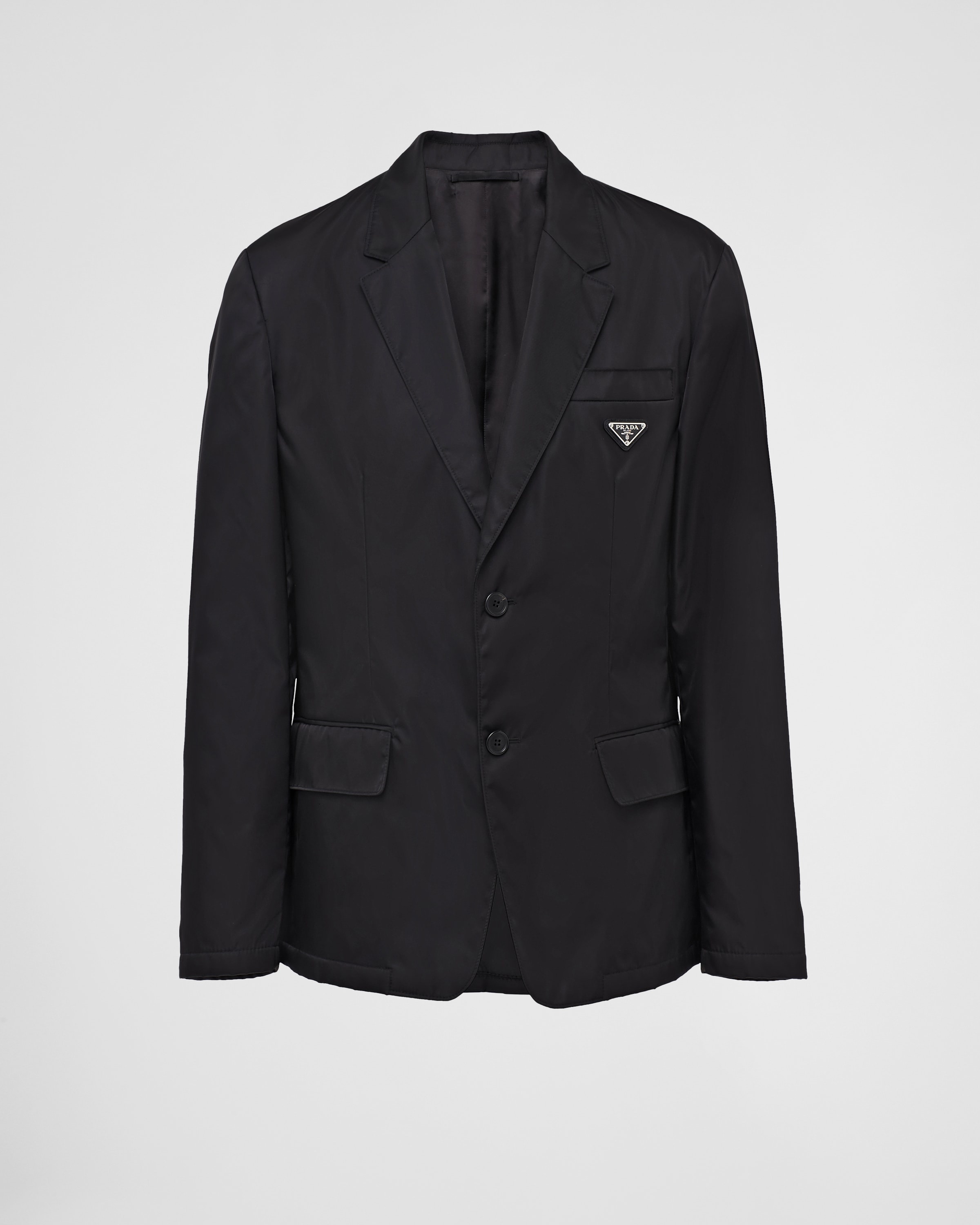 A modern update of the classic single-breasted jacket with lapel collar, the garment has a two-button closure and back vent. The jacket made of Re-Nylon, Prada's innovative signature fabric, is decorated with the iconic enameled metal triangle logo applied on the breast pocket. For sustainable care to preserve the product's characteristics and reduce microfiber shedding, we recommend not washing the item too often. Let the product air out after every use and have it dry cleaned at a specialized ecological dry cleaners. - Product code: SD099_1WQ8_F0002_S_202 - Classic fit - Classic lapels - Back vent at the center - Two-button closure - Cuffs with 3 buttons - Flap pockets - Lined - Enameled metal triangle logo - Tonal top-stitching - The fabric is made of regenerated nylon yarn obtained from plastic trash recovered from the ocean. - Imported Height: 72cm MATERIALS Main material: 100% recycled polyamide