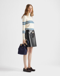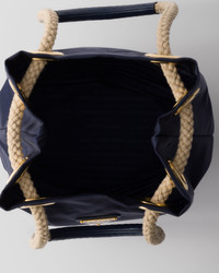 Unusual combinations animate this Re-Nylon bag inspired by the timeless codes of nautical style. Sliding cord handles underline the versatile character of the accessory that can be worn carried by hand or over the shoulder, completed by the enameled metal triangle logo. For sustainable care to preserve the product's characteristics and reduce microfiber shedding, we recommend not washing the item too often. Let the product air out after every use and have it dry cleaned at a specialized ecological dry cleaners. - Product code: 1BE082_2HG8_F0216_V_OOO - Sliding cord and leather handles, drop from 23 to 50 cm - Metal hardware - Enameled metal triangle logo on the front - Logo-print Re-Nylon interior with zipper pocket - Imported Height: 28cm Width: 23.5cm Length: 16.5cm MATERIALS Main material: Recycled polyamide