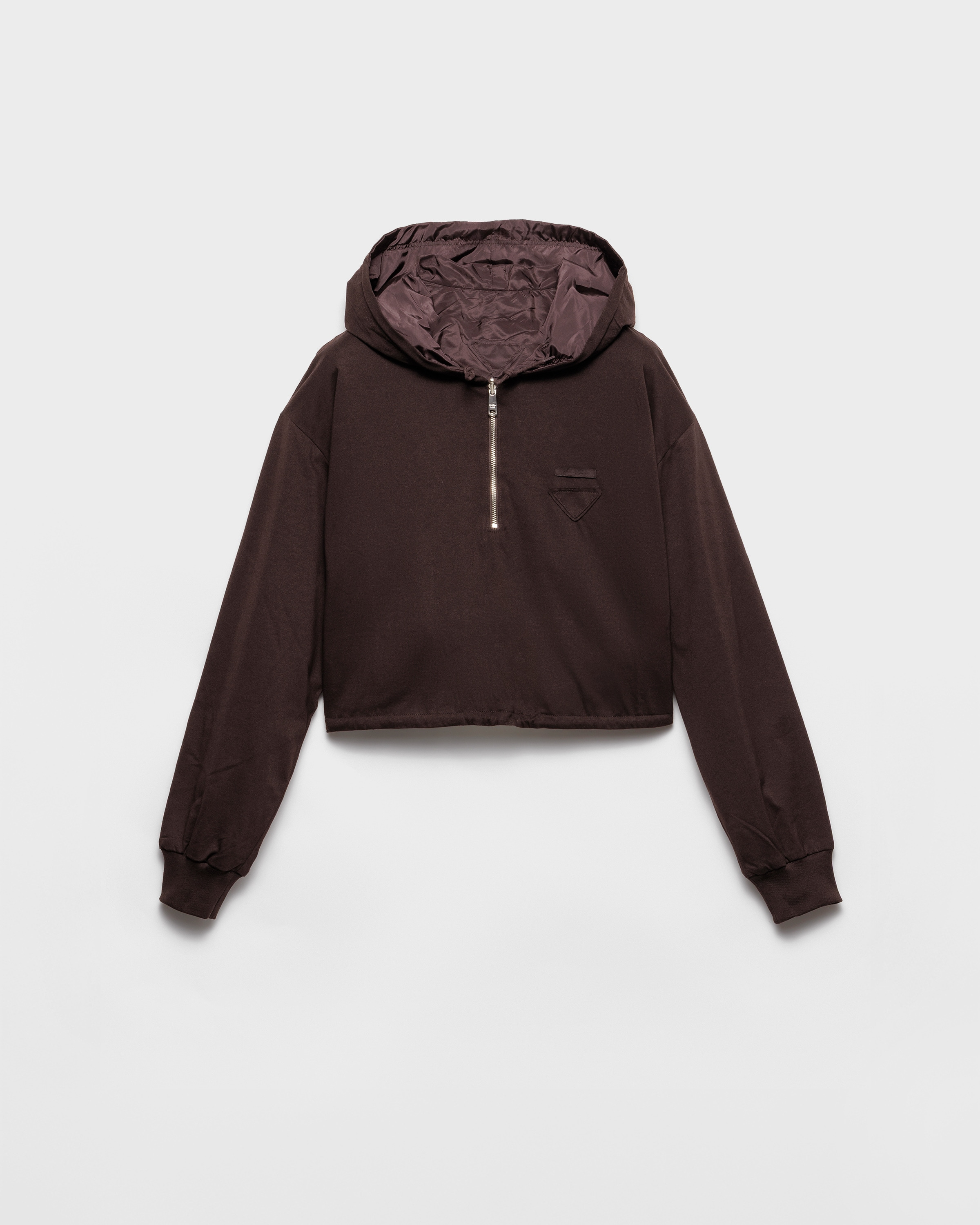 Techwear inspires the design of this reversible boxy hoodie made of cotton jersey with Re-Nylon interior. The drawstring waist highlights the volumes of the sporty silhouette, while the fabric triangle logo completes it with a distinctive note. - Product code: 134719_17XE_F0192_S_OOO - Boxy fit - Long sleeves - Hem with elasticized drawstring - Ribbed knit cuffs - Inseam pockets - Fabric triangle logo - Reversible garment with lightweight Re-Nylon interior - Pressed garment - Imported - The model is 180 cm tall and wears a size 38 Height: 48cm MATERIALS Main material: 100% cotton