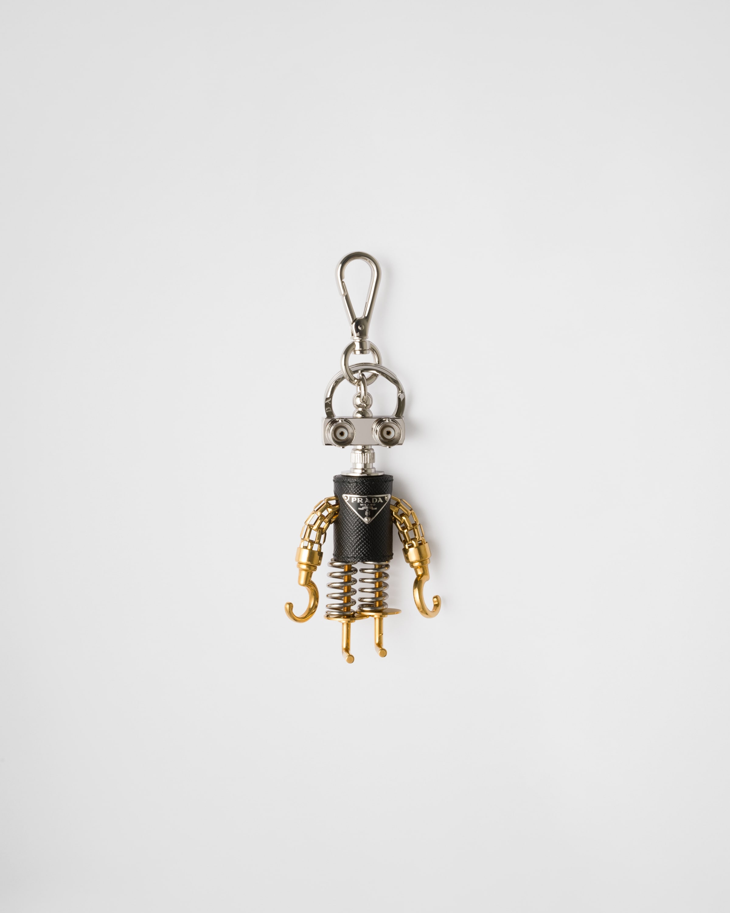 This bag charm's unique and playful design, combining metal and Saffiano leather, enriches every bag with a personal and unique touch. - Product code: 2TR103_EGQ_F0H76 - Snap-hook and ring - Enameled metal triangle logo - Imported Height: 9.5cm MATERIALS Main material: Calfskin