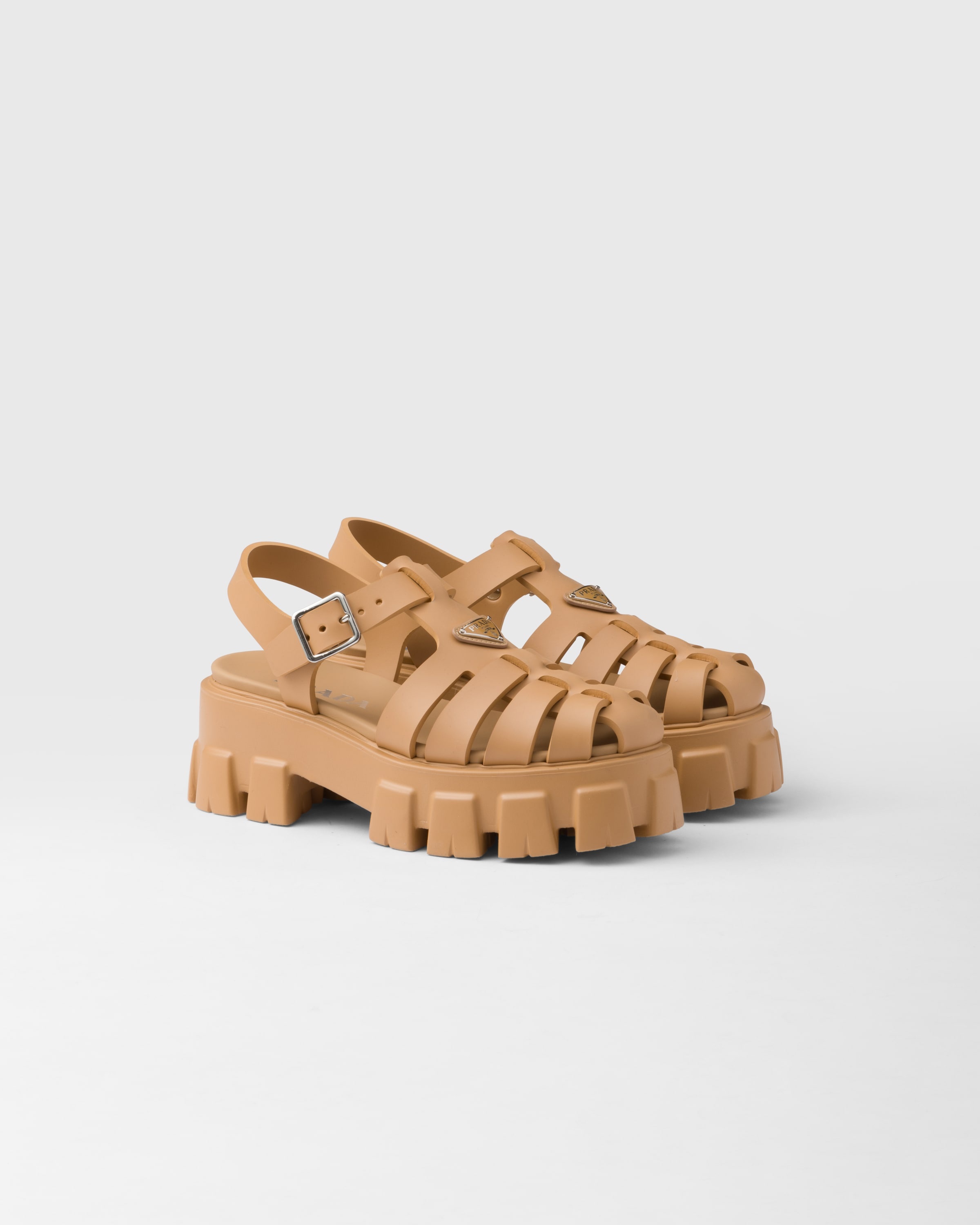 A beach silhouette with retro charm is reinterpreted in a new and contemporary way in the design of these sandals. The timeless style is enriched by the iconic Monolith sole that combines important volumes with light rubber, becoming an expression of Prada's dual soul. The hybrid footwear is decorated with the distinctive enameled metal triangle logo. - Product code: 1X853M_3LKK_F0346_F_DD55 - Upper with metal buckle - Enameled metal triangle logo - Rubber sole, height 55 mm - Lug tread - Imported MATERIALS Main material: Ethyl vinyl acetate - eva