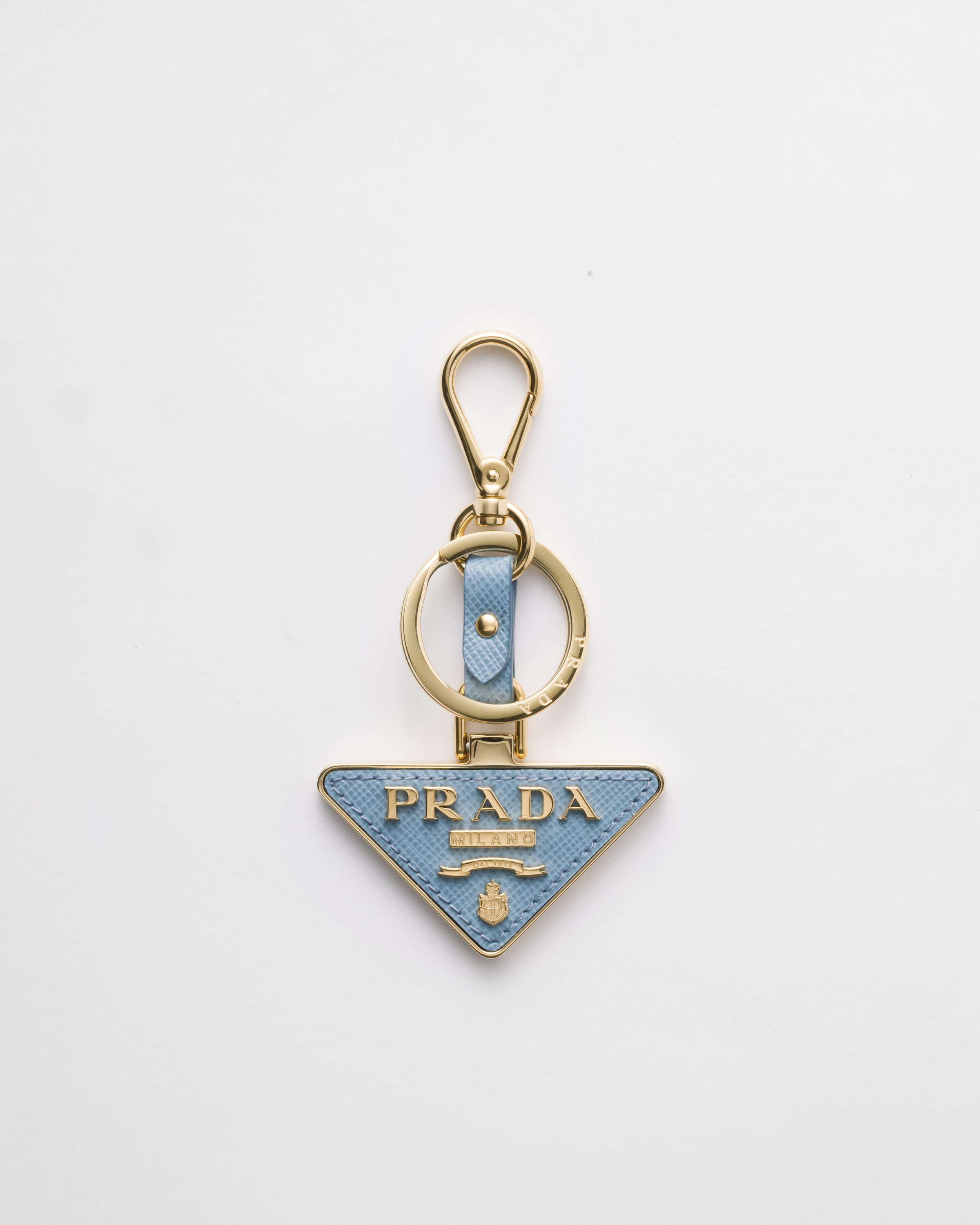 This Saffiano leather keychain has metal details and is shaped like the iconic Prada triangle logo. - Product code: 1PP128_053_F0637 - With snap-hook and ring - Metal lettering logo - Imported MATERIALS Main material: Calfskin