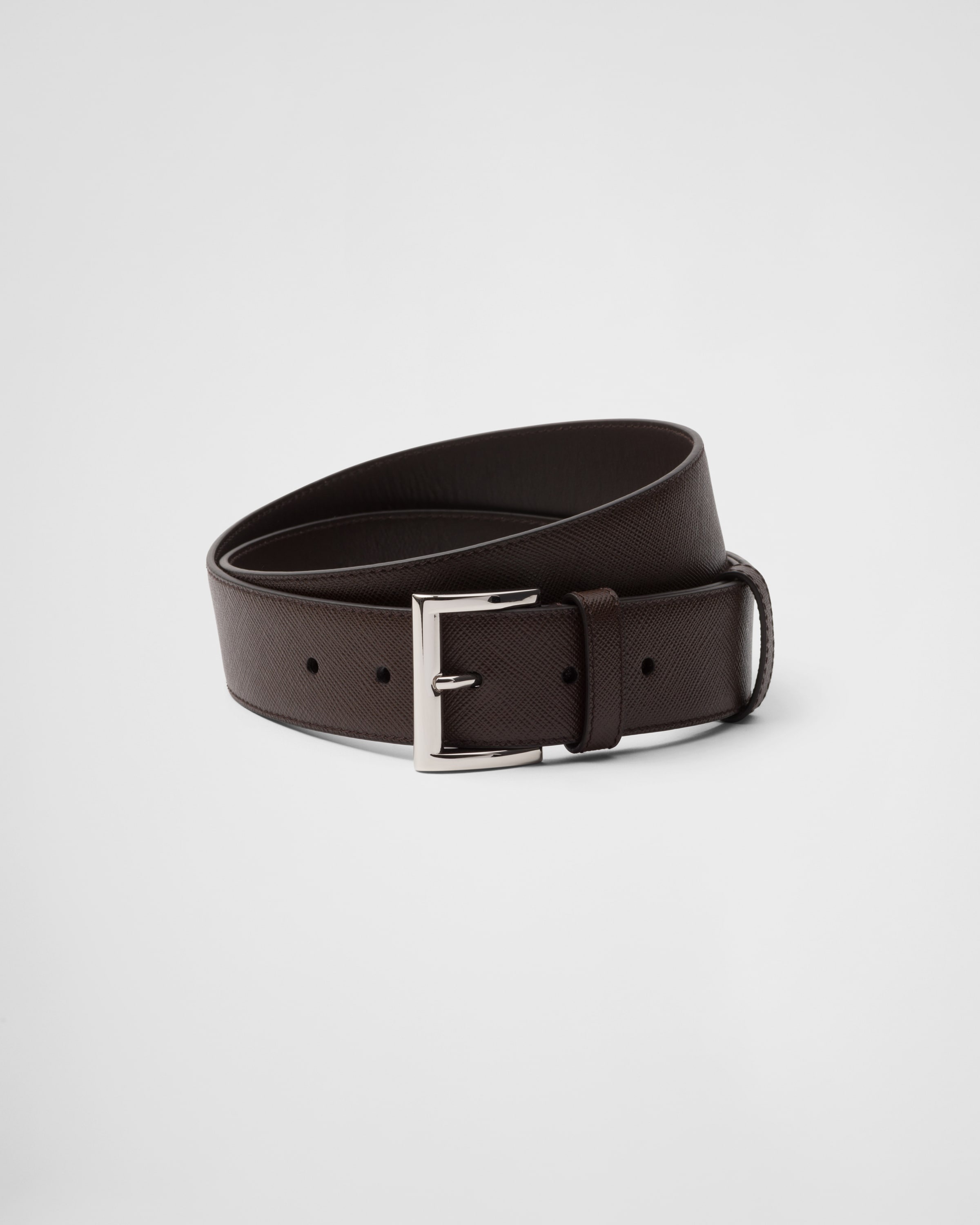 This belt characterized by a sleek, refined design is completed with a metal buckle and decorated with the triangle logo that stands out on the tip. The design is made from the brand's iconic Saffiano leather, which is defined by its waxed finish and crosshatch texture. - Product code: 2CC545_053_F0201 - Metal buckle - Enameled metal triangle logo - Imported Height: 3.5cm MATERIALS Main material: Calfskin