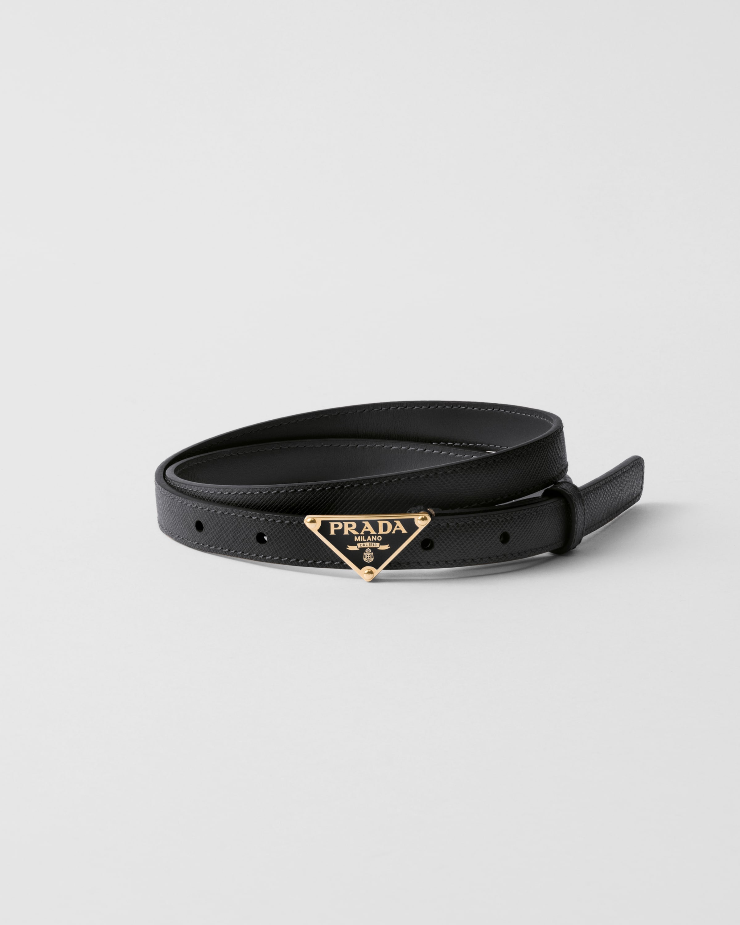 This belt characterized by its sleek, refined design is completed with a metal buckle that recalls the emblematic triangle logo. The design is made of the brand's iconic Saffiano leather with its distinctive waxed finish and crosshatch texture. - Product code: 1CC621_053_F0002 - Triangular metal buckle--Lettering logo - Imported Height: 1.5cm MATERIALS Main material: Calfskin