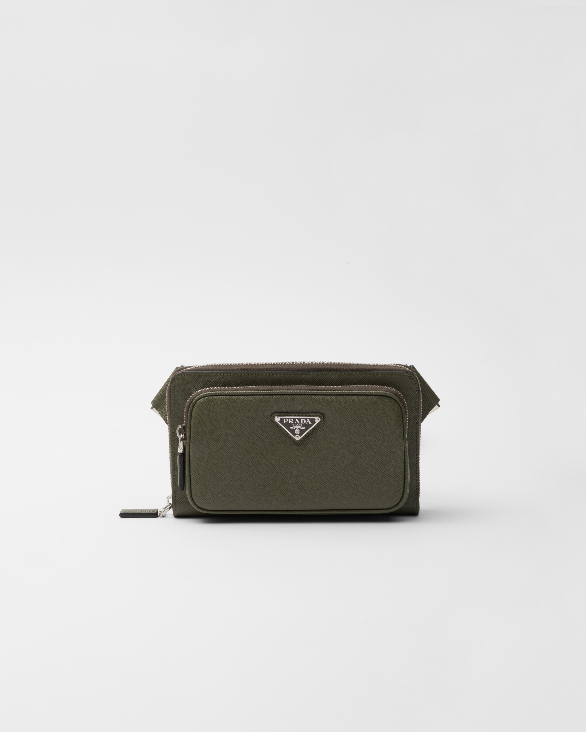 The hybrid concept that pervades the Prada narrative is reflected in this belt bag with modern allure. Sleek, elegant lines combined with fine Saffiano leather create a dialog with details from technical sports world, enriching the design of the accessory with new aesthetic visions. The iconic enameled metal triangle logo decorates the bag on the front. - Product code: 2VH156_9Z2_F03QJ_V_OOO - Adjustable woven nylon tape shoulder strap and side-release buckle - Enameled metal triangle logo on the front - Zipper closure - External zipper pocket - Small back pocket - Card slots inside - Leather lining - Imported Height: 13cm Width: 21cm MATERIALS Main material: Calfskin