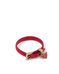 This elegant Saffiano leather bracelet decorated with a metal triangle logo charm stands out for its feminine design. - Product code: 1IB351_053_F068Z - Metal buckle closure - Logo loop with enameled metal triangle charm - Imported Height: 1cm Width: 1cm MATERIALS Main material: Calfskin