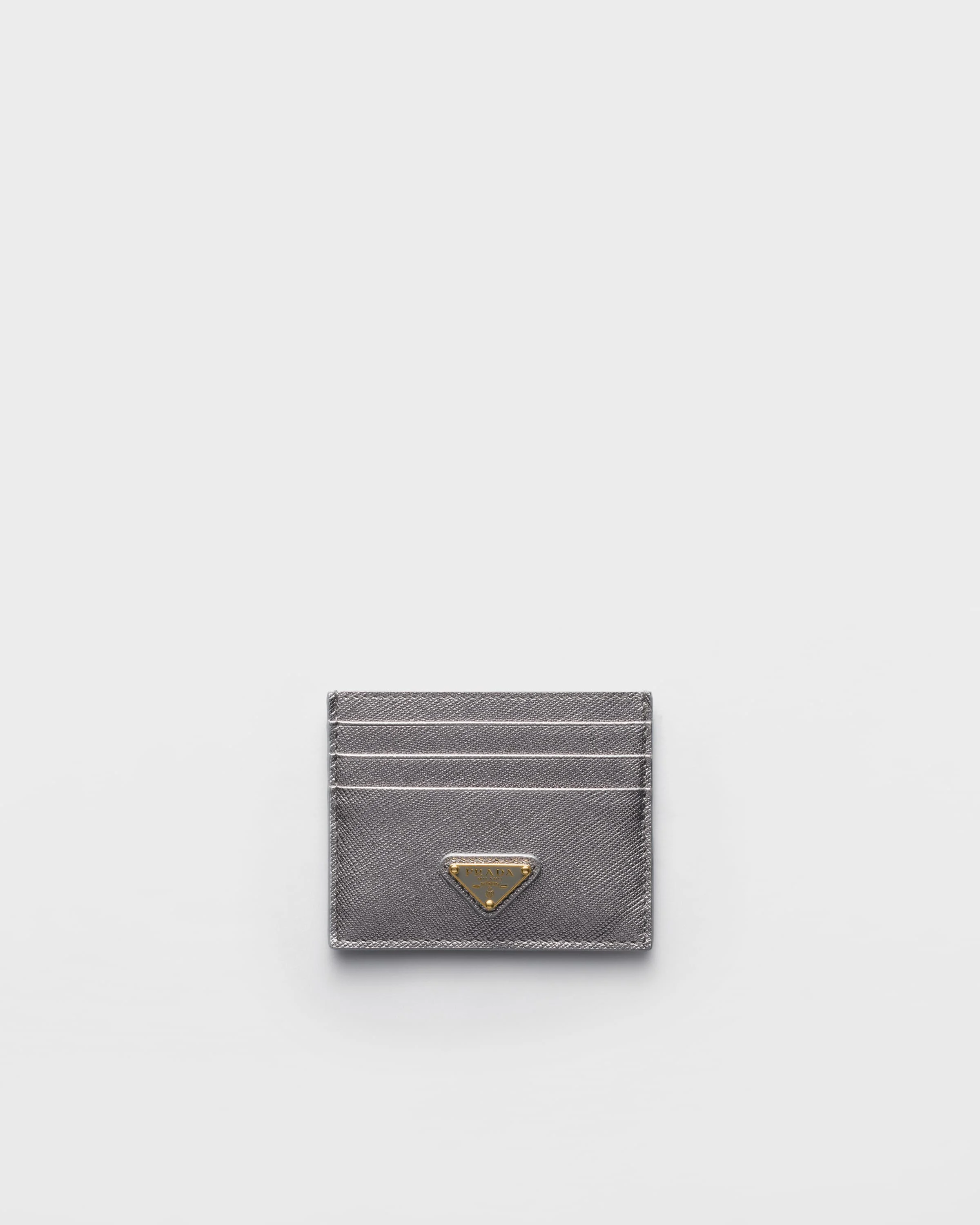 The unmistakable texture of Saffiano leather characterizes this sleek card holder. The accessory with six card slots is decorated with a tonal enameled metal triangle logo. - Product code: 1MC025_QHH_F0135 - Enameled metal triangle logo - Six card slots - One inside pocket - Moire and Saffiano leather lining - Imported Height: 8cm Width: 10cm MATERIALS Main material: Calfskin