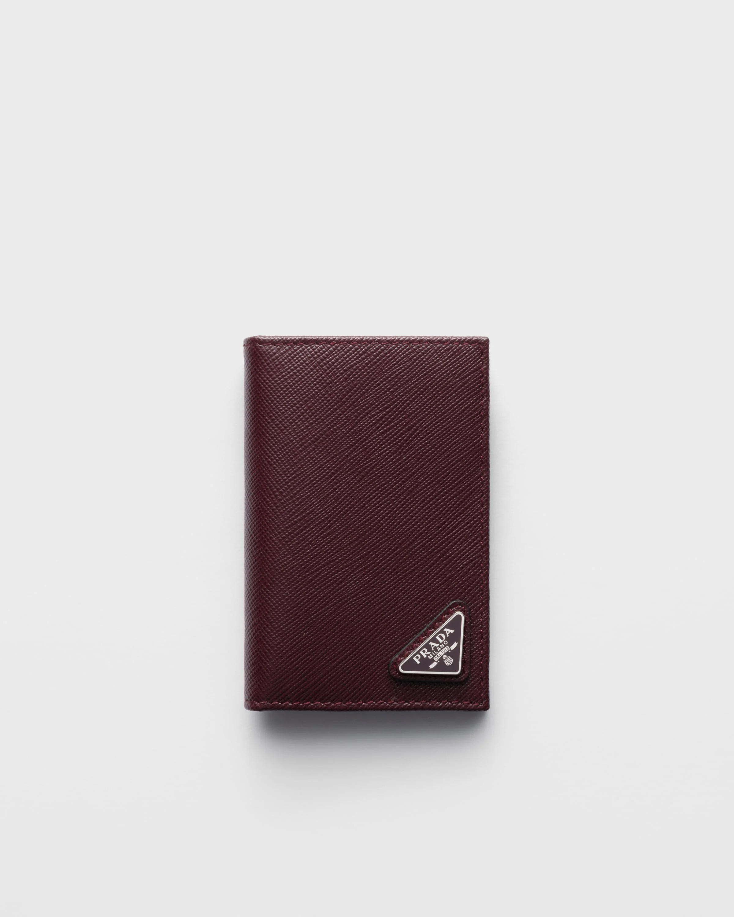 A monotone Saffiano leather credit card holder with triangular Prada logo in the corner. Inside contains six credit card slots, two pockets and a heat-embossed Prada logo. - Product code: 2MC101_QHH_F0007 - Enameled metal triangle logo - Six card slots - Moire and Saffiano leather lining - Imported Height: 11cm Width: 7cm MATERIALS Main material: Calfskin