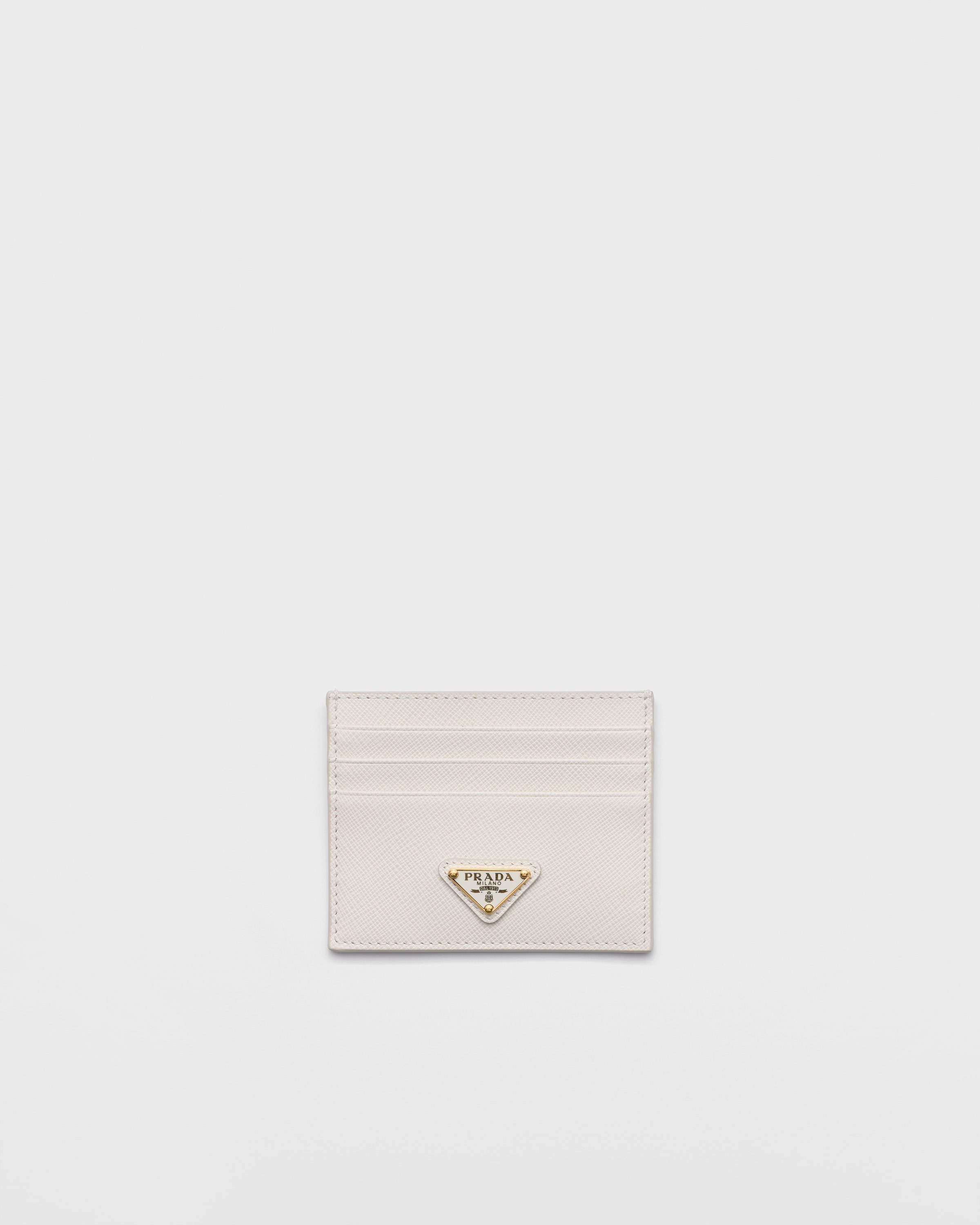 The unmistakable texture of Saffiano leather characterizes this sleek card holder. The accessory with six card slots is decorated with a tonal enameled metal triangle logo. - Product code: 1MC025_QHH_F0K74 - Enameled metal triangle logo - Six card slots - One inside pocket - Moire and Saffiano leather lining - Imported Height: 8cm Width: 10cm MATERIALS Main material: Calfskin