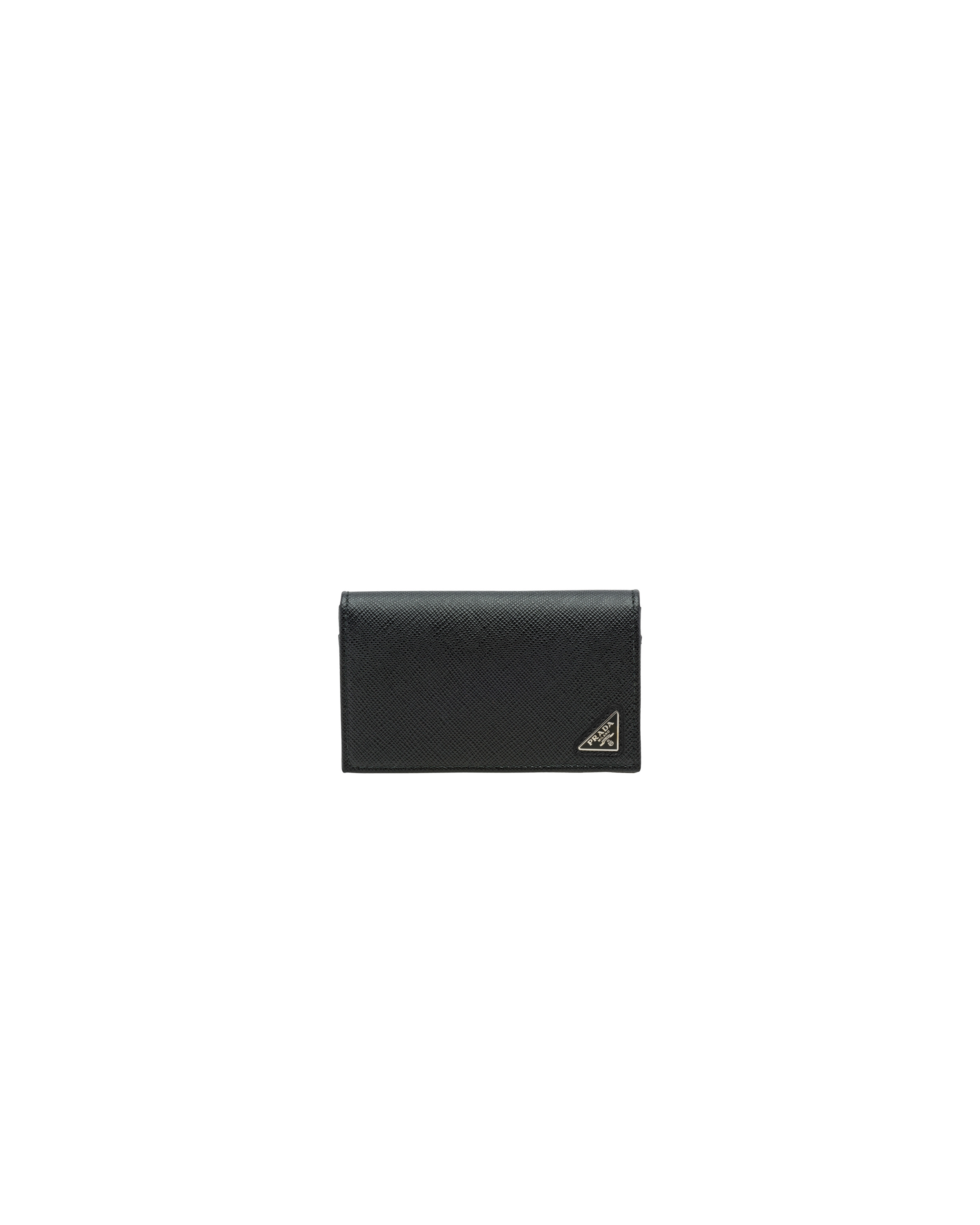 This functional card holder is built from fine Saffiano leather in a handsome wallet construction. Inside, it offers one main compartment containing a further three flat sections, fully lined throughout. - Product code: 2MC122_QHH_F0002 - Snap fastener - Enameled metal triangle logo - Two card slots - One inside pocket - External pocket with card slots - Moire and Saffiano leather lining - Imported Height: 6.5cm Width: 11cm MATERIALS Main material: Calfskin