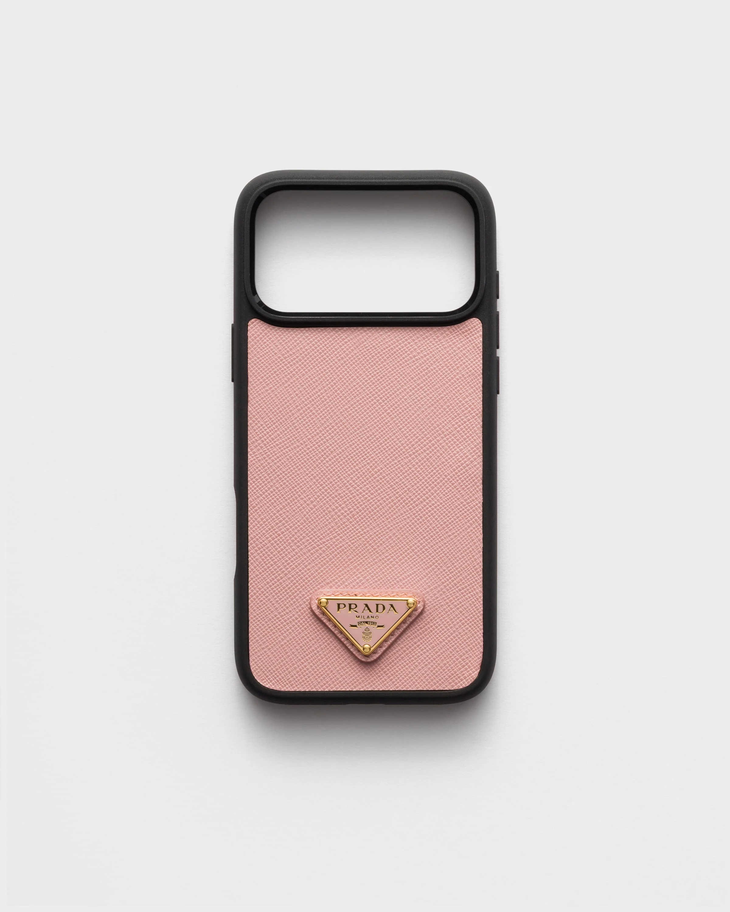 This Saffiano leather case for the iPhone 17 Pro has a sleek and sophisticated design decorated with the emblematic enameled metal triangle logo. - Product code: 1ZH221_QHH_F0924 - Enameled metal triangle logo - Imported MATERIALS Main material: Calfskin