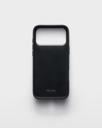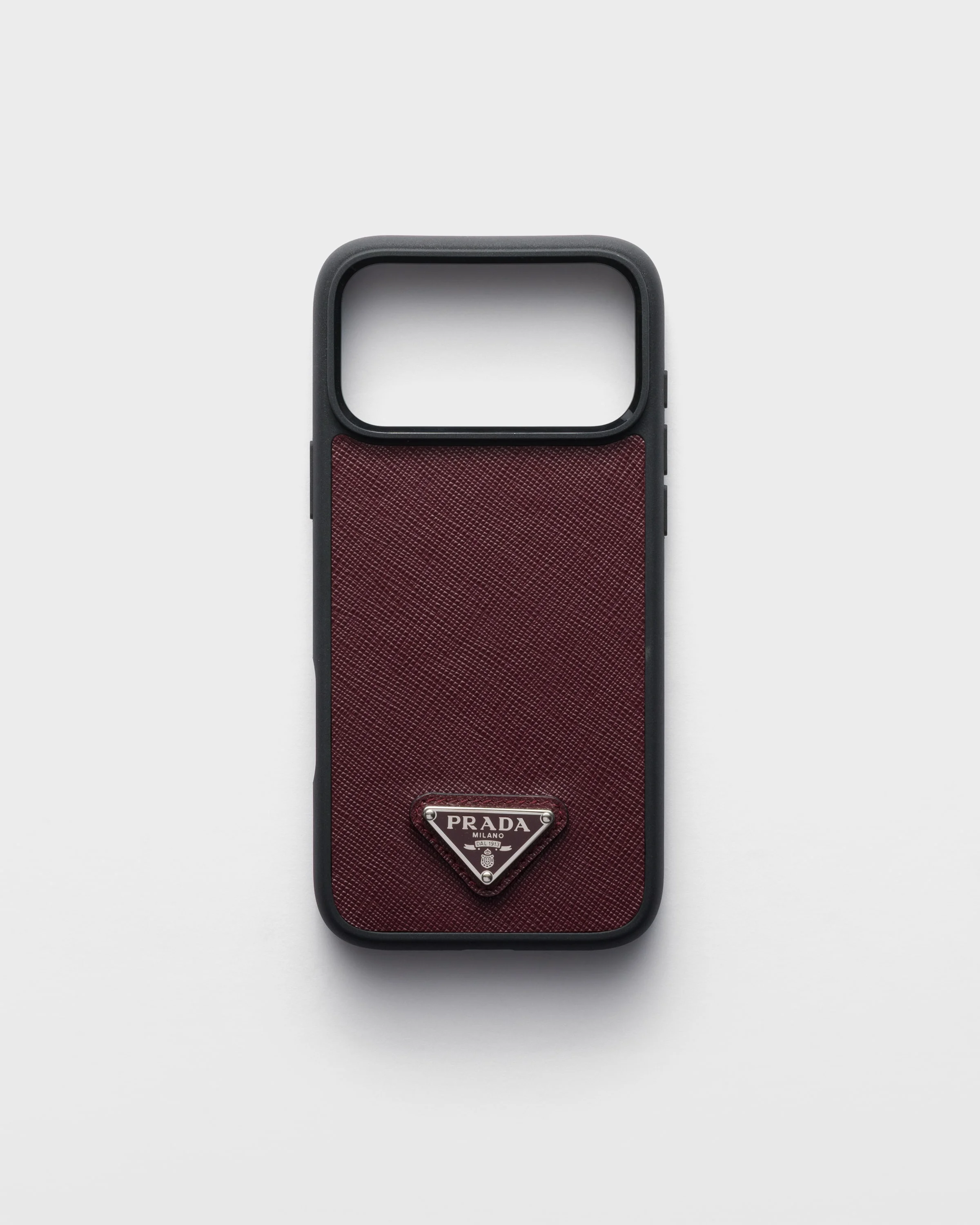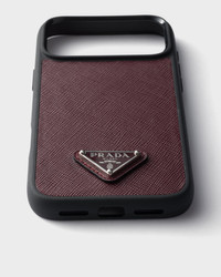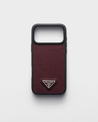 Emblematic Saffiano leather, characterized by the distinctive crosshatch texture with a waxed finish, enriches this elegant case for the iPhone 17 Pro Max, decorated with the triangle logo. - Product code: 2ZH222_QHH_F0007 - Enameled metal triangle logo - Imported MATERIALS Main material: Calfskin