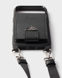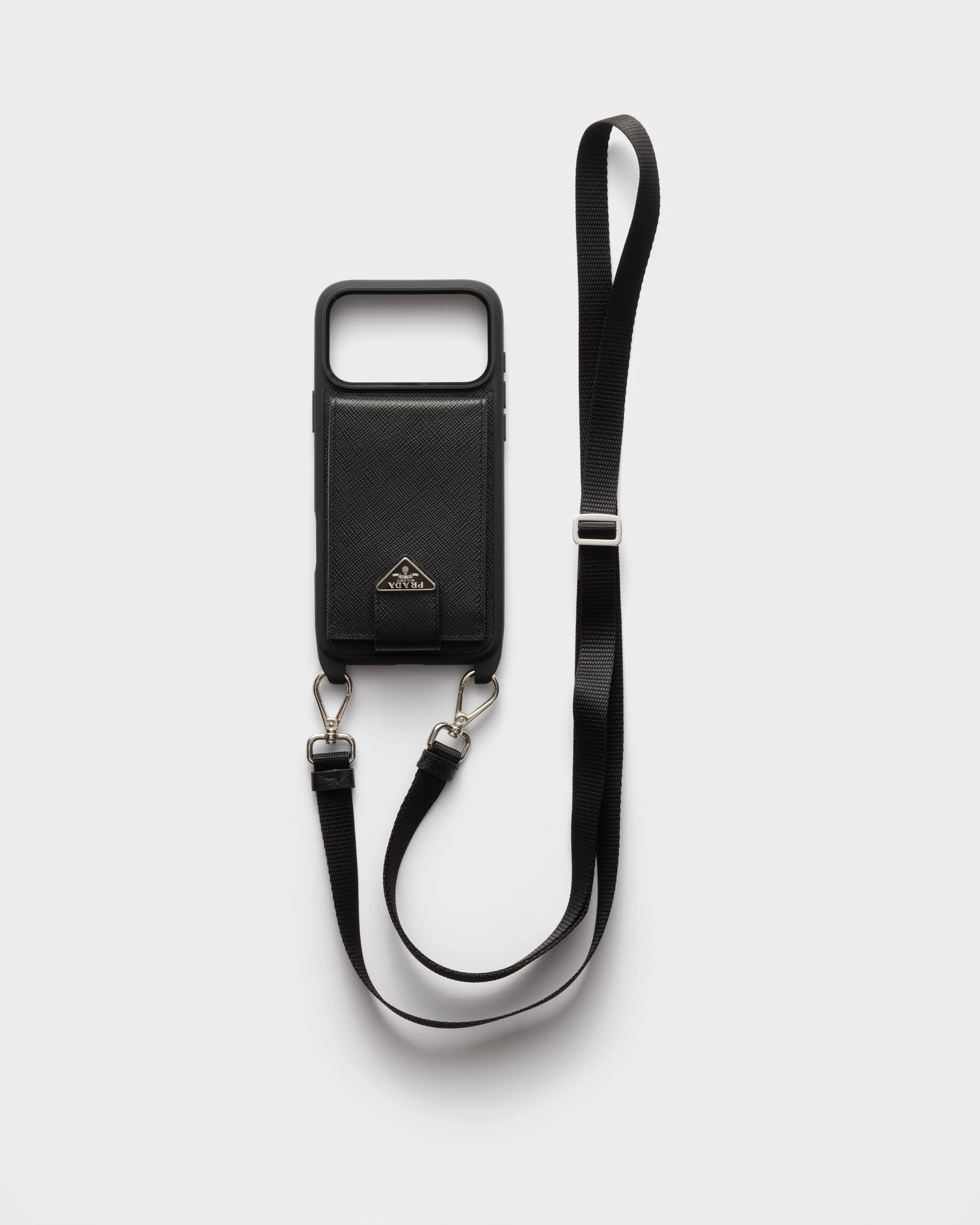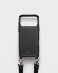 This iPhone 17 Pro Max case combines Prada's emblematic codes in a sophisticated, modern design. Enhanced by the elegant crosshatch texture of Saffiano leather, the accessory features a practical, detachable and adjustable shoulder strap. The enameled metal triangle logo completes the accessory with an iconic note. - Product code: 2ZH223_QHH_F0002 - With attached card holder - Enameled metal triangle logo - Adjustable, detachable woven nylon tape shoulder strap - Imported MATERIALS Main material: Calfskin