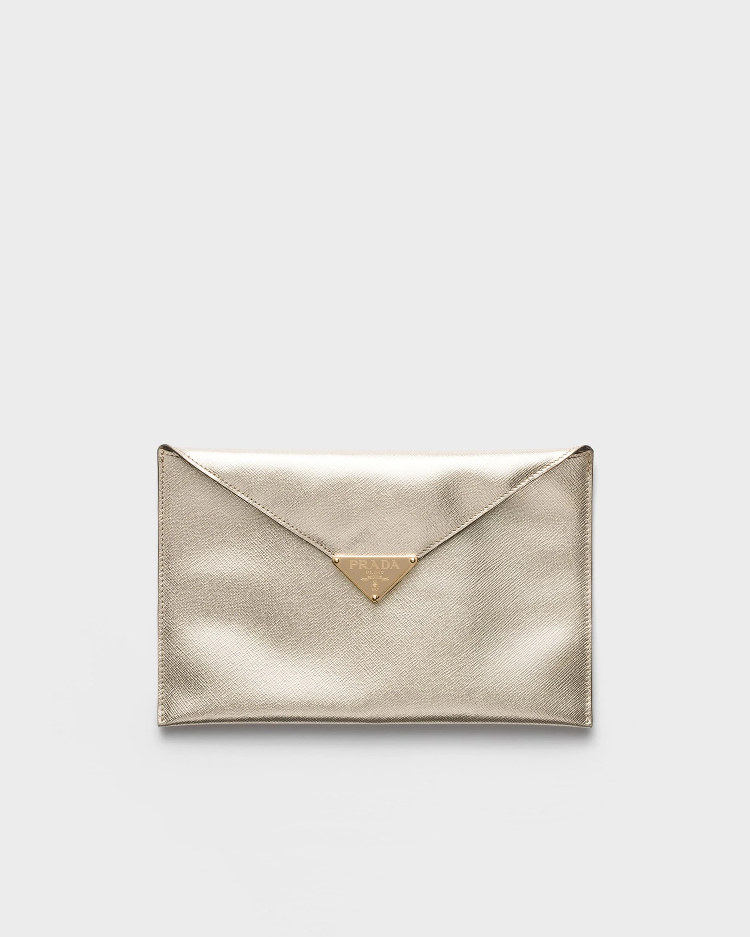 This sophisticated and functional envelope clutch in Saffiano leather has a sleek design. The accessory with card slots is decorated with the enameled metal triangle logo. - Product code: 1MF048_2CLQ_F0846 - Snap closure - Enameled metal triangle logo - Three card slots - Leather lining - Imported Height: 15cm Width: 23cm MATERIALS Main material: Calfskin