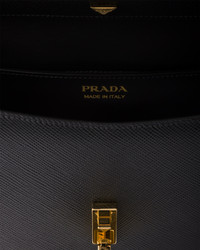 This shoulder bag plays with the concept of simplicity in its lines and compact size, combining versatility and elegance in a refined design. The bag made of Saffiano leather comes with an adjustable shoulder strap enriched with metal hardware, like the iconic triangle logo embellishing the clasp. - Product code: 1BD320_2A4A_F0002_V_YTO - Adjustable leather shoulder strap. Maximum length 116 cm - Minimum length 104 cm - Maximum drop 55 cm - Minimum drop 45 cm - Back pocket - Metal hardware - Enameled metal triangle logo on clasp - Flap closure with logoed push-lock clasp - Logo-print nylon lining with patch pocket - Imported Height: 15cm Width: 22cm Length: 6cm MATERIALS Main material: Calfskin