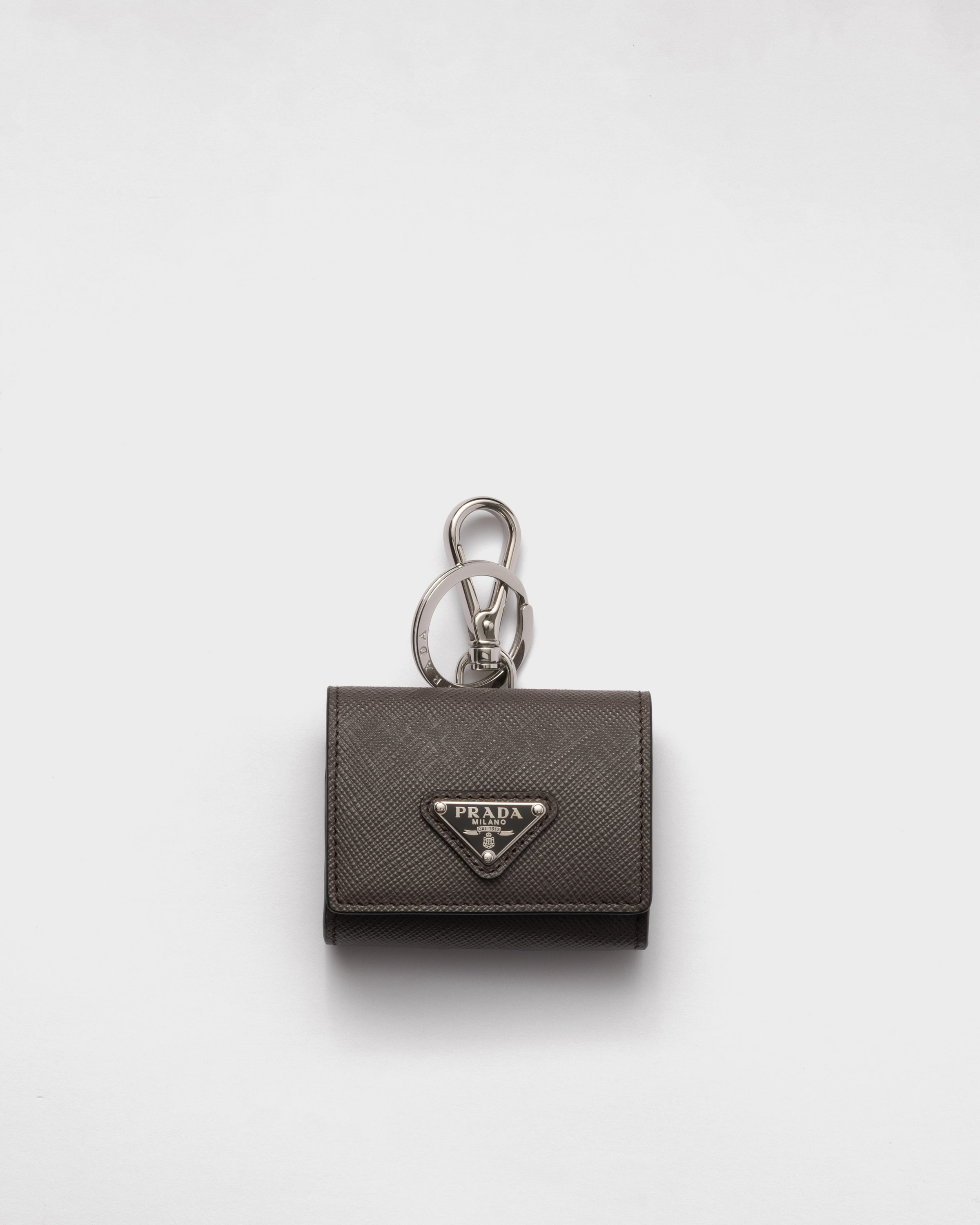 Made of Saffiano leather, a brand hallmark, this headphone case is defined by the enamel triangle logo on the front. The accessory has a metal snap-hook and ring. - Product code: 2TT133_2AHF_F0170 - Saffiano leather - Flap closure with snap - Enamel triangle logo on the front - Metal snap-hook with ring - Imported Height: 6cm Width: 7.5cm MATERIALS Main material: Calfskin