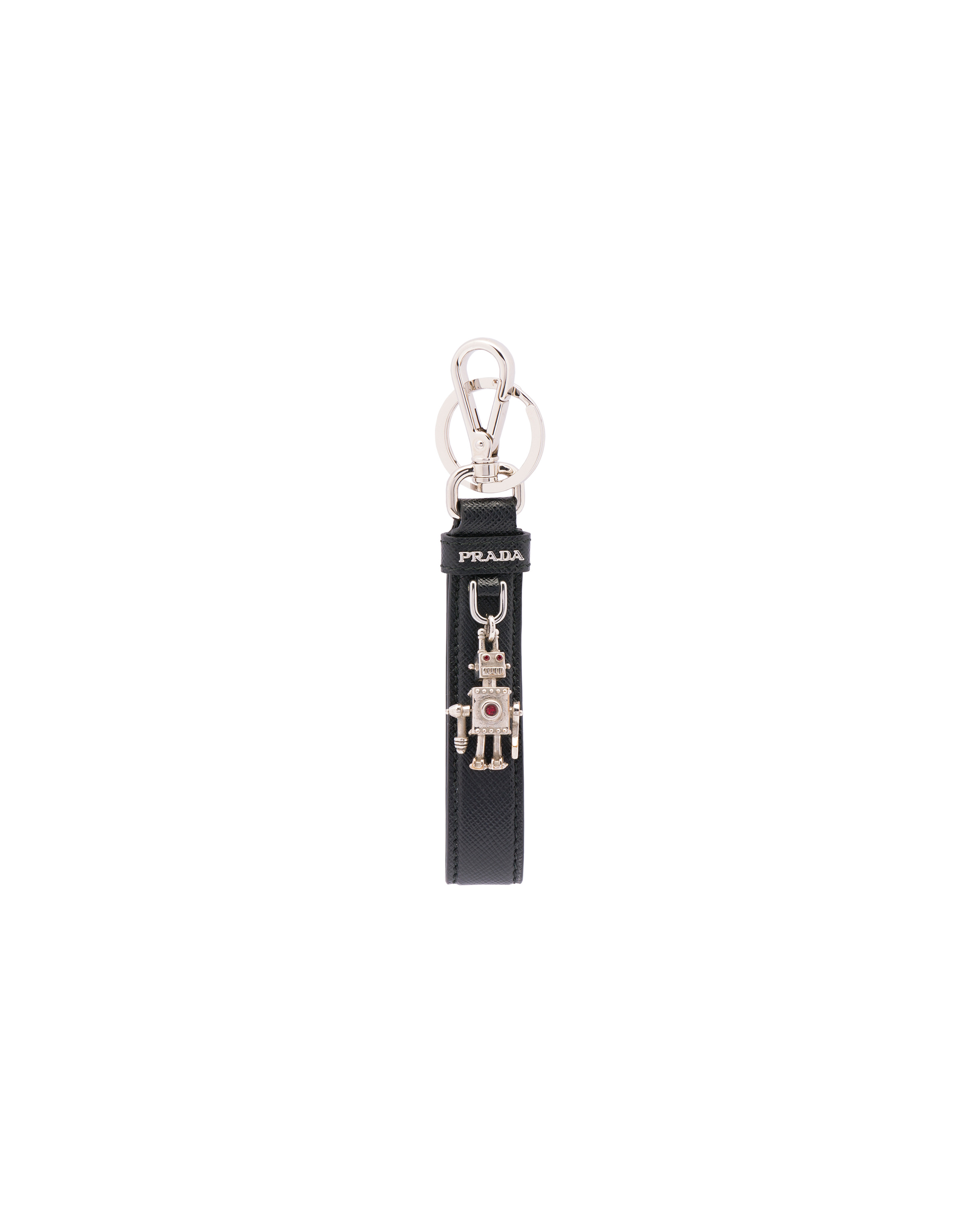 Saffiano leather key trick featuring a delightful steel and enamel robot charm. Steel Prada lettering completes the piece. - Product code: 1PP001_053_F0632 - Saffiano leather with steel and enamel charm - Steel hook and split ring - Metal lettering logo - Imported Height: 10cm Width: 2cm MATERIALS Main material: Calfskin