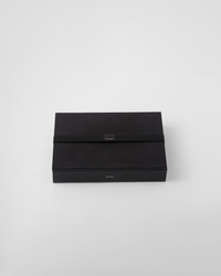 This complete poker set with chips, dice, and playing cards comes in a luxurious box made of Saffiano leather: a leather of superior quality defined by its crosshatch pattern and waxed finish. Saffiano leather, an iconic Prada material, is synonymous with luxury and is identified with traditional Italian leather goods production. - Product code: 2SG007_0DC_F0002 - With poker dice set - With chip set - With two Prada pencils - With two decks of cards - Metal lettering logo - Imported - Leather Height: 8.5cm Width: 34cm Length: 25cm