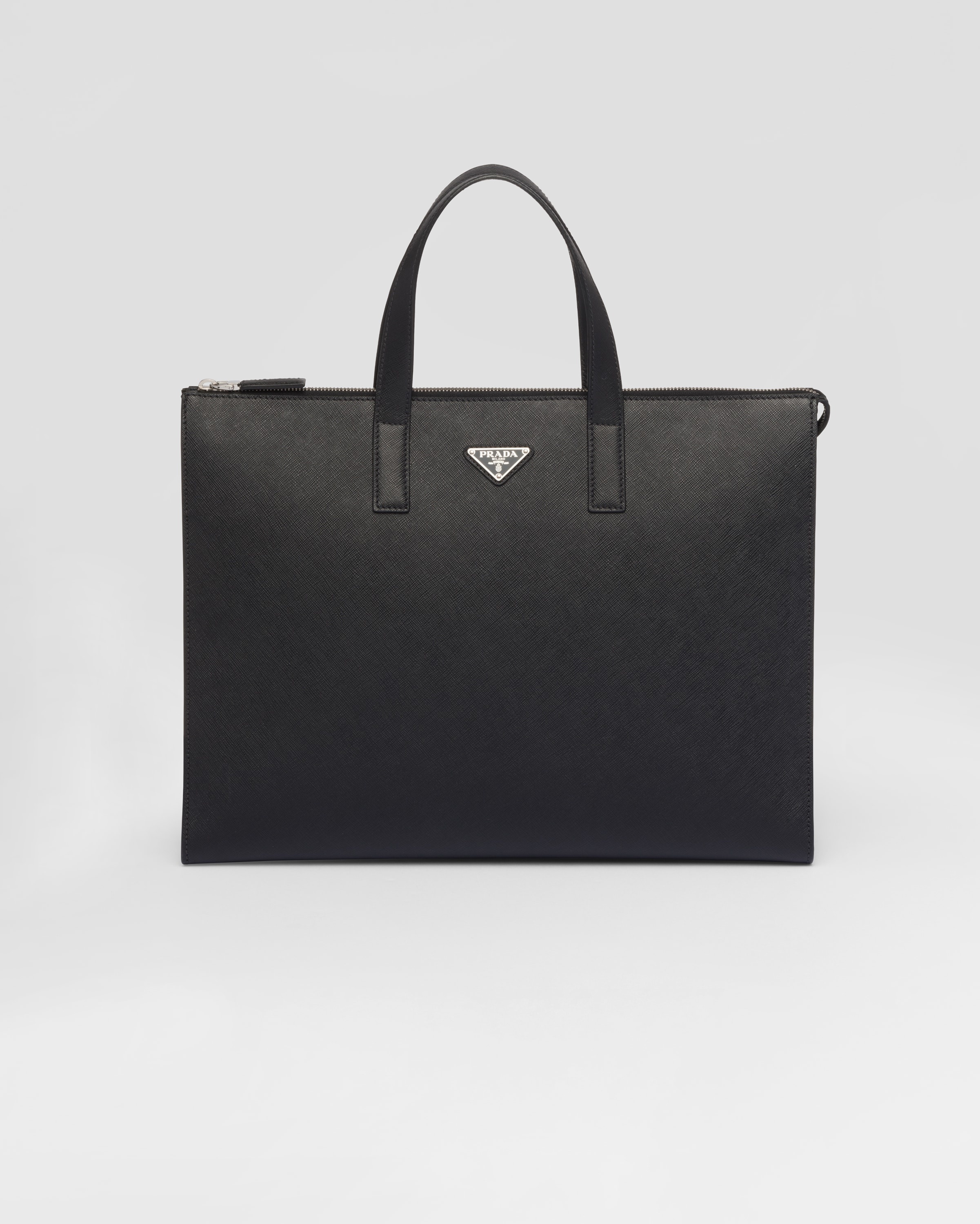 This sleek tote, a blend of modernity and classicism, is decorated with the triangle logo that first appeared on the trunks designed by Mario Prada in 1913. Saffiano leather, an iconic Prada material with a crosshatch pattern and wax finish, is synonymous with luxury and identifies with traditional Italian leather goods production. - Product code: 2VG039_9Z2_F0002_V_MOO - Flat leather handles - Enameled metal triangle logo on the front - Zipper closure - Interior with zipper pocket, patch pocket and small patch pocket - Prada logo nylon lining - Imported Height: 30cm Width: 40cm Length: 9cm MATERIALS Main material: Calfskin