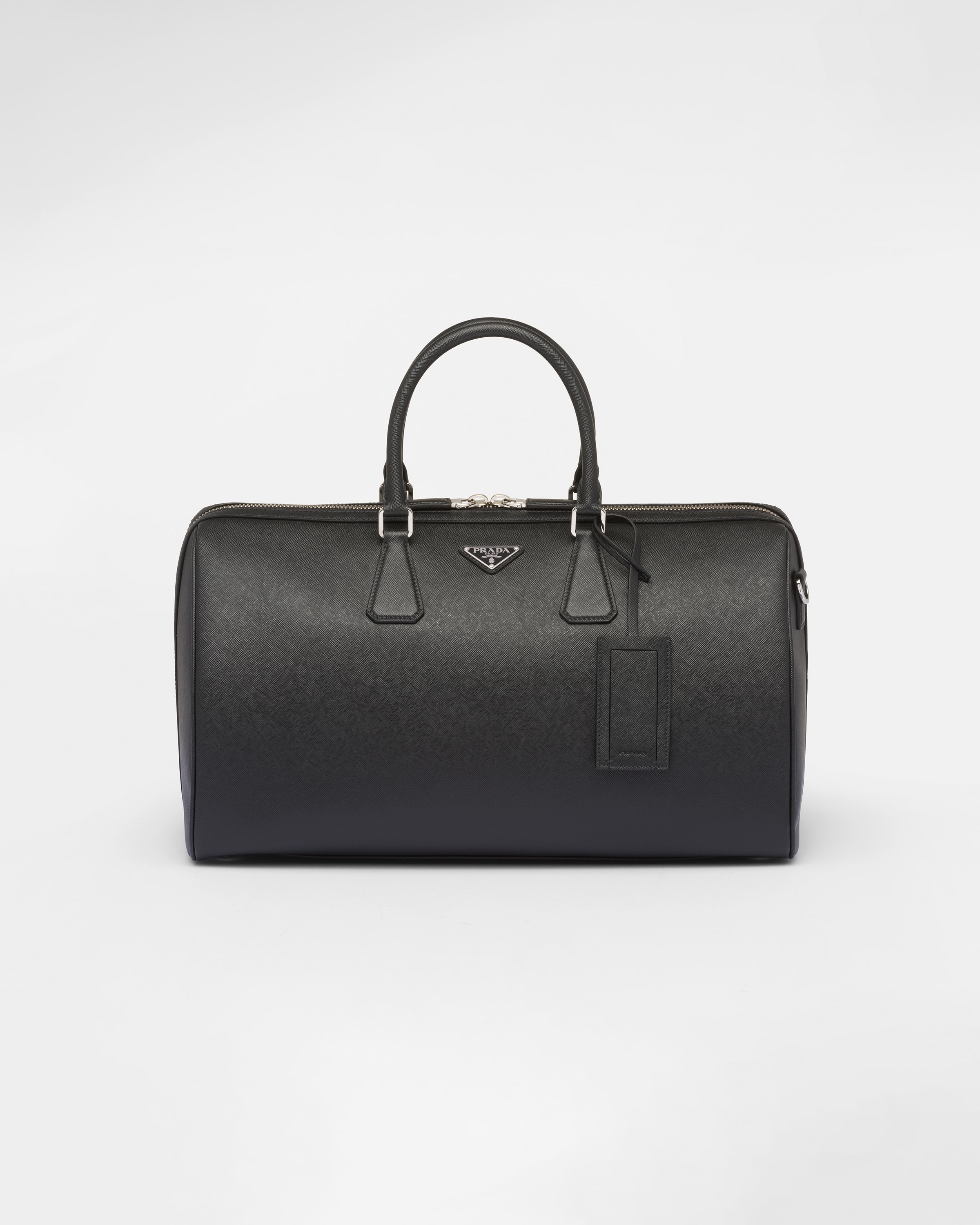 The elegant design of this travel bag is emphasized by the cross-hatch texture and waxed finish of iconic Saffiano leather. The accessory with sleek lines and a practical detachable shoulder strap is decorated with the distinctive signature touch of the enameled metal triangle logo. - Product code: 2VC034_9Z2_F0002_V_OOO - Leather handles - Detachable adjustable woven nylon tape shoulder strap - Enameled metal triangle logo on the front - Zipper closure - Removable leather name tag - Interior with two zipper pockets - Logo-print nylon lining - Metal purse feet - Imported Height: 24.5cm Width: 45cm Length: 23cm MATERIALS Main material: Calfskin