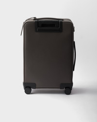 This trolley with an elegant, functional design is made of Saffiano leather, an iconic Prada material that enhances the design with its unmistakable crosshatch pattern with waxed finish. - Product code: 2VQ005_9Z2_F03SG_V_OOO - Leather handles - Enameled metal triangle logo on the front - Zipper closure with TSA combination lock - Removable leather name tag - Telescopic handle on the back - Internal zipper compartment and compartment with elasticized straps - Logo-print Re-Nylon lining - Capacity: 33.5 L - Four wheels - Imported Height: 56cm Width: 36cm Length: 22cm MATERIALS Main material: Calfskin