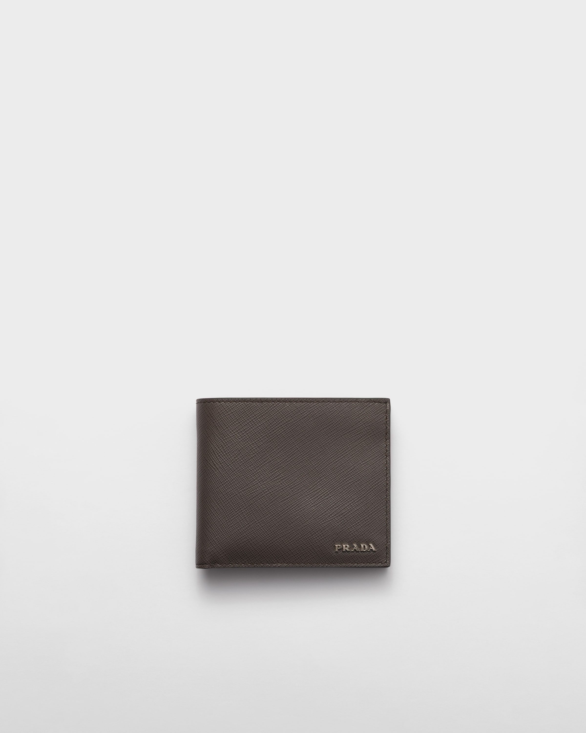 This wallet pairs the cross-hatch design of Saffiano leather with a Prada metal text logo on the front. It opens to eight credit card slots, and several compartments and pockets, fabric lined throughout. - Product code: 2MO513_2FPJ_F0BR0 - Contrasting color interior - Metal lettering logo - Eight card slots - Two bill compartments - Moire and Saffiano leather lining - Imported Height: 9.5cm Width: 11cm MATERIALS Main material: Calfskin