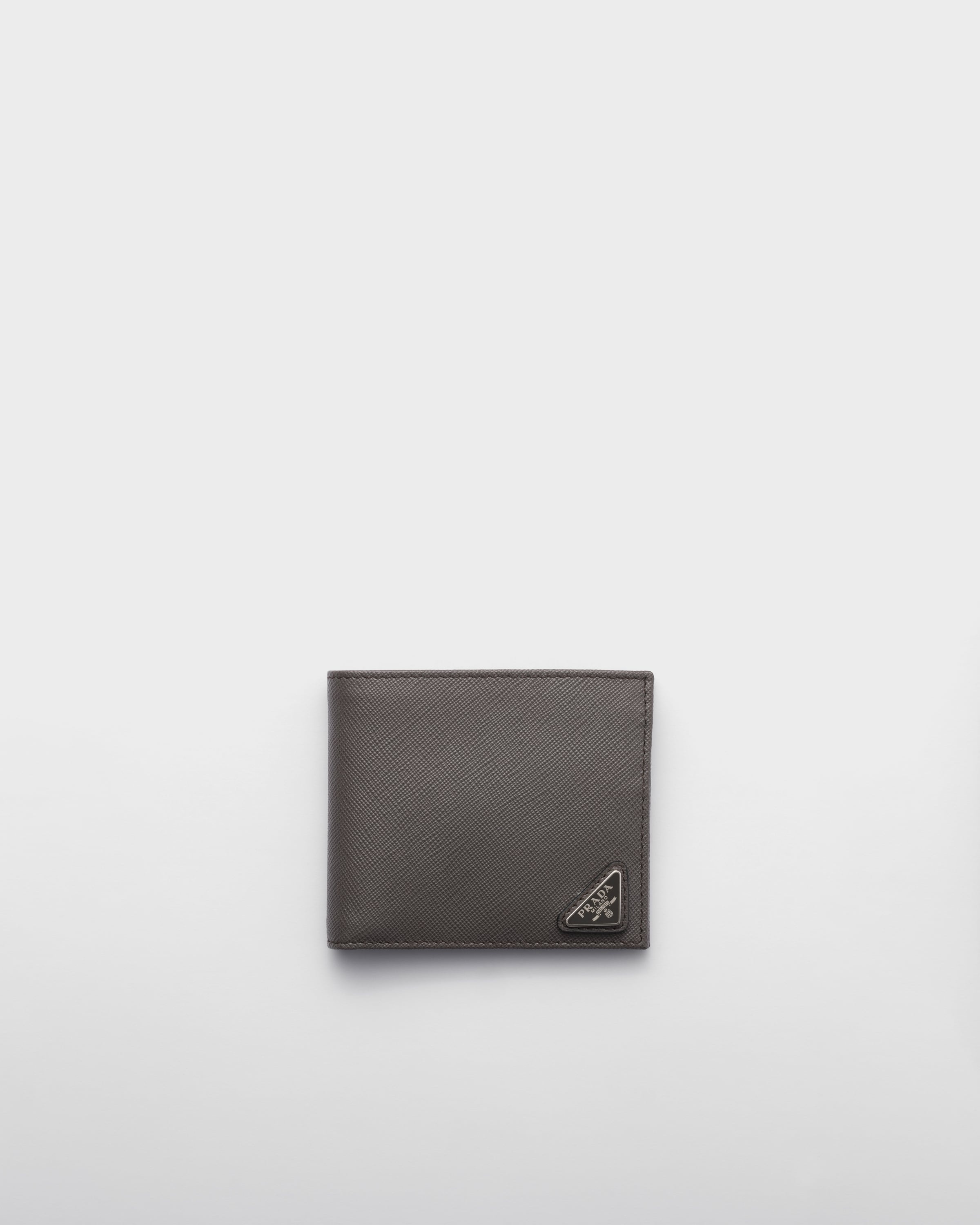 An elegant monochrome wallet decorated with the triangular logo in the corner. Crafted entirely from hard-wearing Saffiano leather, the bi-fold design offers ample pockets for coins, bills and cards. - Product code: 2MO738_QHH_F0170 - Enameled metal triangle logo - Four card slots - Two bill compartments - Internal coin pocket with flap - Moire and Saffiano leather lining - Imported Height: 9.5cm Width: 11cm MATERIALS Main material: Calfskin