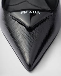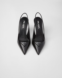 The distinctive crosshatch pattern of Saffiano leather meets a glossy patent leather finish in these slingback pumps with a contemporary design. The pointy slingback style is defined by the geometric heel and the leather triangle logo slightly padded for a three-dimensional effect that completes the feminine shoe with modernist allure. - Product code: 1I901M_3A9S_F0002_F_DD75 - Screen-printed leather triangle logo - Leather sole with metal lettering logo - Varnished heel, height: 75 mm - Imported MATERIALS Main material: Calfskin