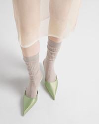 These sophisticated, delicate mules with timeless elegance have a tapered silhouette with precise lines. The refined simplicity of the design is enhanced by the lustrous satin finish that enriches the footwear with a refined, modern touch. - Product code: 1I975N_049_F065J_F_B055 - Leather sole with rubber heel tip - Metal lettering logo - Satin-covered heel, height 55 mm. - Imported MATERIALS Main material: Silk viscose