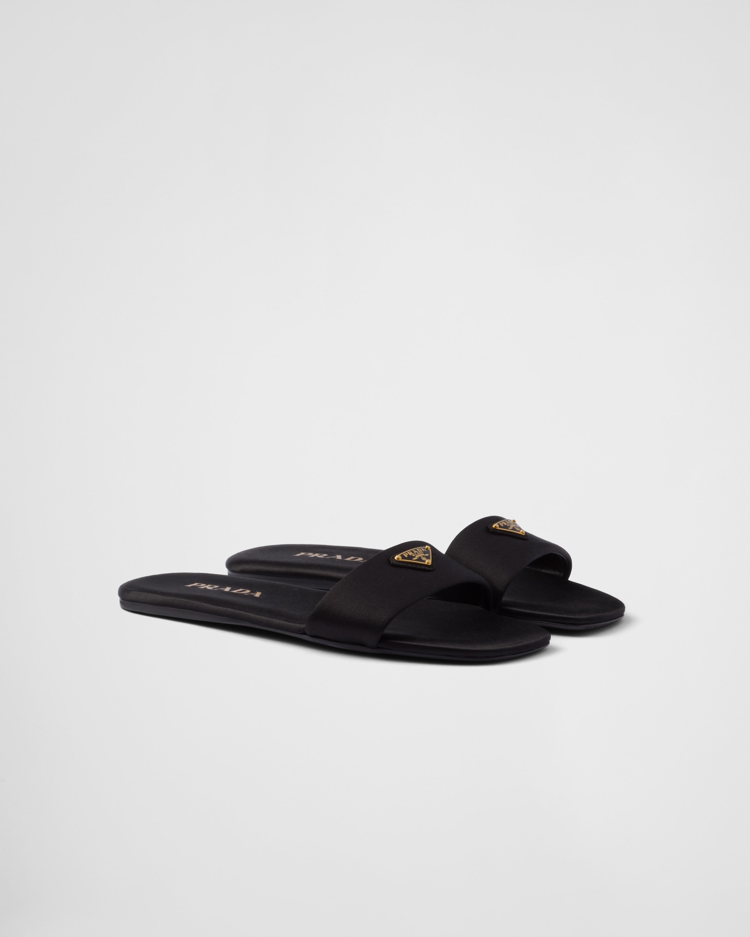 These flat slides have a sleek design enriched by the sophisticated satin finish that gives the footwear refined allure. The flat, sleek silhouette with a square toe is completed by the iconic signature of the enameled metal triangle logo. - Product code: 1XX355_049_F0002_F_D005 - Enameled metal triangle logo - Monoblock leather sole, 5 mm, with hot-stamped logo - Satin-covered insole - Imported MATERIALS Main material: Silk viscose