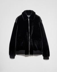 Soft, oversized lines define this bomber jacket with a sporty design made of shearling that emphasizes the volume of the garment, decorated with the tonal leather triangle logo. - Product code: UPW528_12DG_F0002_S_OOO - Unlined - Oversized fit - Center zipper closure - Shirt-style collar - Straight sleeves with ribbed knit cuffs - Flapped pockets - Ribbed knit hem - Leather triangle logo on the back - Imported - The model is 188 cm tall and wears a size 48 Height: 70cm MATERIALS Main material: Lambskin